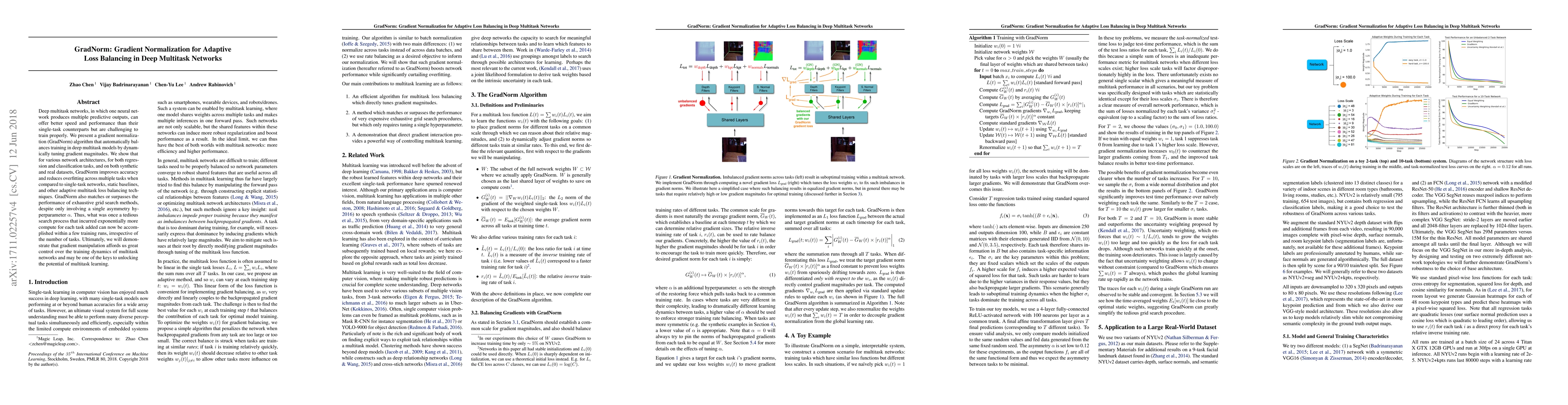 GradNorm dynamically normalizes gradients to balance training in deep multitask networks, improving accuracy and reducing overfitting across various tasks and datasets. This method simplifies loss balancing, matching the performance of exhaustive grid search with just one hyperparameter.
