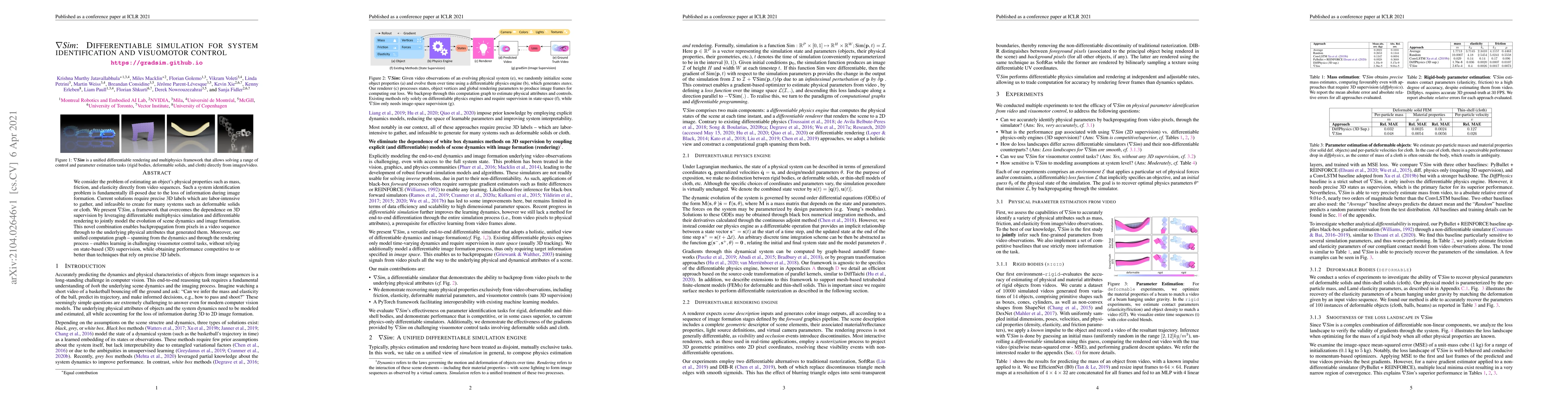 gradSim introduces a framework for estimating object physical properties from video using differentiable simulation and rendering, eliminating the need for labor-intensive 3D labels. This approach enables backpropagation from video pixels to physical attributes and supports visuomotor control tasks with competitive performance.
