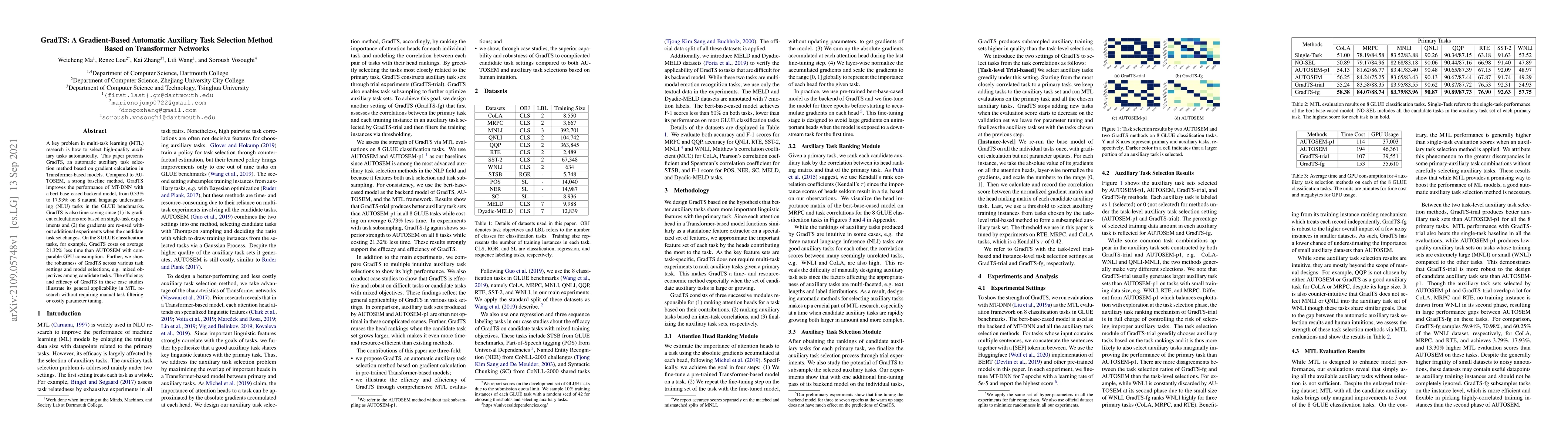A key problem in multi-task learning (MTL) research is how to select high-quality auxiliary tasks automatically. This paper presents GradTS, an automatic auxiliary task selection method based on gradient calculation in Transformer-based models. Compared to AUTOSEM, a strong baseline method, GradTS improves the performance of MT-DNN with a bert-base-cased backend model, from 0.33% to 17.93% on 8 natural language understanding (NLU) tasks in the GLUE benchmarks. GradTS is also time-saving since (1) its gradient calculations are based on single-task experiments and (2) the gradients are re-used without additional experiments when the candidate task set changes. On the 8 GLUE classification tasks, for example, GradTS costs on average 21.32% less time than AUTOSEM with comparable GPU consumption. Further, we show the robustness of GradTS across various task settings and model selections, e.g. mixed objectives among candidate tasks. The efficiency and efficacy of GradTS in these case studies illustrate its general applicability in MTL research without requiring manual task filtering or costly parameter tuning.