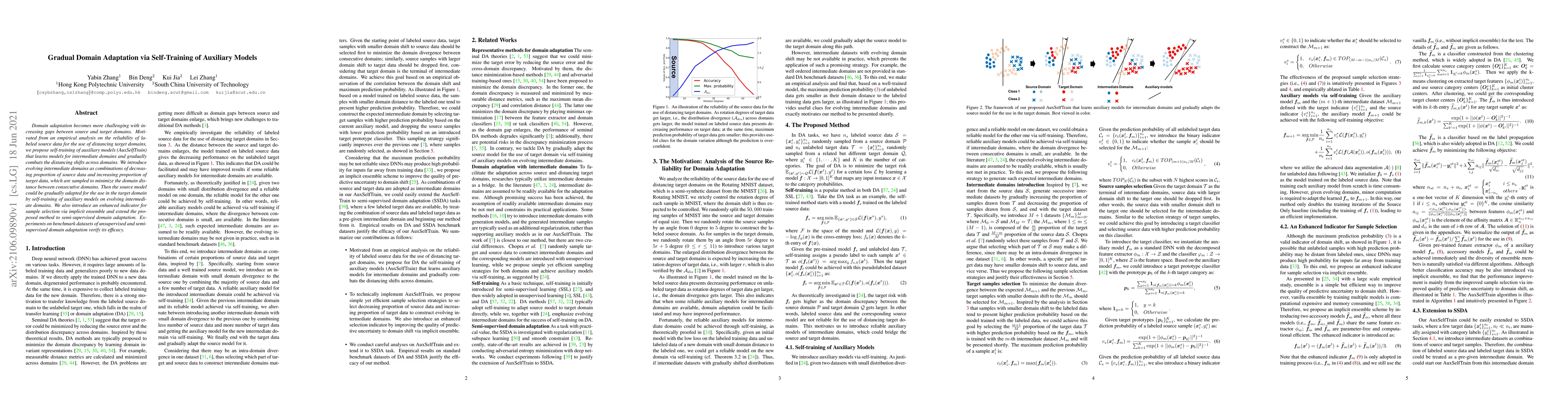 Domain adaptation becomes more challenging with increasing gaps between source and target domains. Motivated from an empirical analysis on the reliability of labeled source data for the use of distancing target domains, we propose self-training of auxiliary models (AuxSelfTrain) that learns models for intermediate domains and gradually combats the distancing shifts across domains. We introduce evolving intermediate domains as combinations of decreasing proportion of source data and increasing proportion of target data, which are sampled to minimize the domain distance between consecutive domains. Then the source model could be gradually adapted for the use in the target domain by self-training of auxiliary models on evolving intermediate domains. We also introduce an enhanced indicator for sample selection via implicit ensemble and extend the proposed method to semi-supervised domain adaptation. Experiments on benchmark datasets of unsupervised and semi-supervised domain adaptation verify its efficacy.