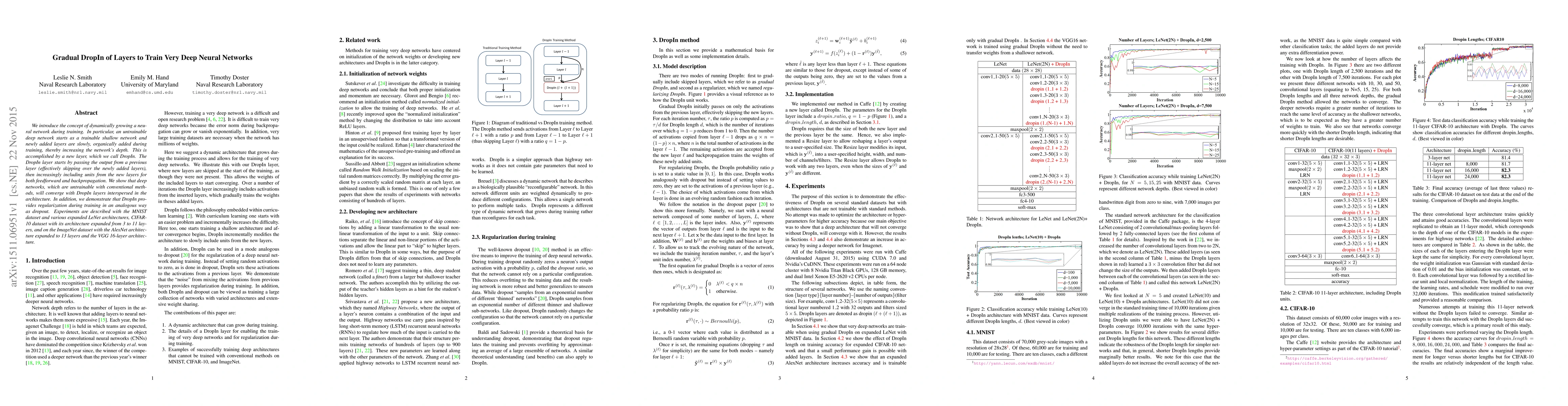 We introduce the concept of dynamically growing a neural network during training. In particular, an untrainable deep network starts as a trainable shallow network and newly added layers are slowly, organically added during training, thereby increasing the network's depth. This is accomplished by a new layer, which we call DropIn. The DropIn layer starts by passing the output from a previous layer (effectively skipping over the newly added layers), then increasingly including units from the new layers for both feedforward and backpropagation. We show that deep networks, which are untrainable with conventional methods, will converge with DropIn layers interspersed in the architecture. In addition, we demonstrate that DropIn provides regularization during training in an analogous way as dropout. Experiments are described with the MNIST dataset and various expanded LeNet architectures, CIFAR-10 dataset with its architecture expanded from 3 to 11 layers, and on the ImageNet dataset with the AlexNet architecture expanded to 13 layers and the VGG 16-layer architecture.