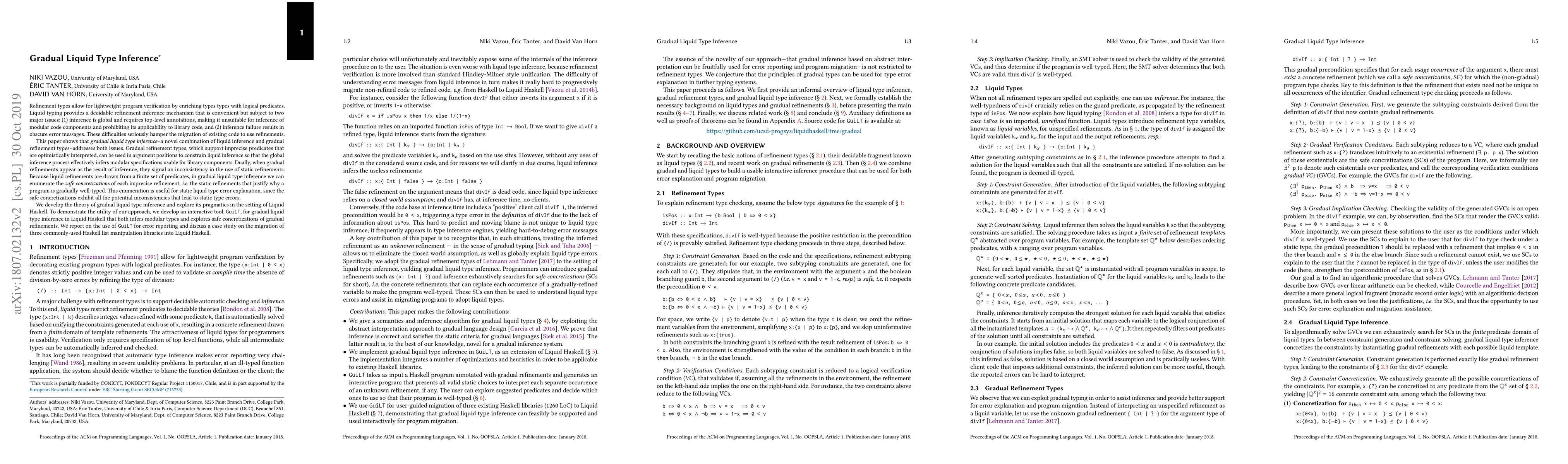 Liquid typing provides a decidable refinement inference mechanism that is convenient but subject to two major issues: (1) inference is global and requires top-level annotations, making it unsuitable for inference of modular code components and prohibiting its applicability to library code, and (2) inference failure results in obscure error messages. These difficulties seriously hamper the migration of existing code to use refinements. This paper shows that gradual liquid type inference---a novel combination of liquid inference and gradual refinement types---addresses both issues. Gradual refinement types, which support imprecise predicates that are optimistically interpreted, can be used in argument positions to constrain liquid inference so that the global inference process e effectively infers modular specifications usable for library components. Dually, when gradual refinements appear as the result of inference, they signal an inconsistency in the use of static refinements. Because liquid refinements are drawn from a nite set of predicates, in gradual liquid type inference we can enumerate the safe concretizations of each imprecise refinement, i.e. the static refinements that justify why a program is gradually well-typed. This enumeration is useful for static liquid type error explanation, since the safe concretizations exhibit all the potential inconsistencies that lead to static type errors. We develop the theory of gradual liquid type inference and explore its pragmatics in the setting of Liquid Haskell.