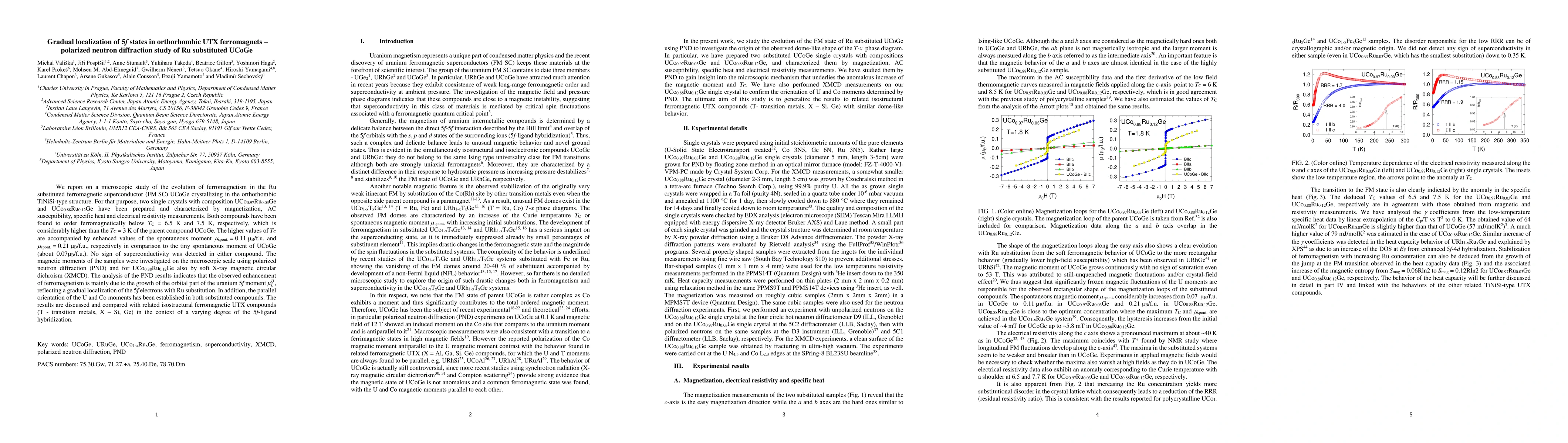 This study investigates the ferromagnetism in Ru-substituted UCoGe using magnetization and neutron diffraction techniques. Enhanced TC and spontaneous moments are observed, attributed to the increased localization of uranium 5f orbital moments due to Ru substitution, with both U and Co moments aligned parallelly.