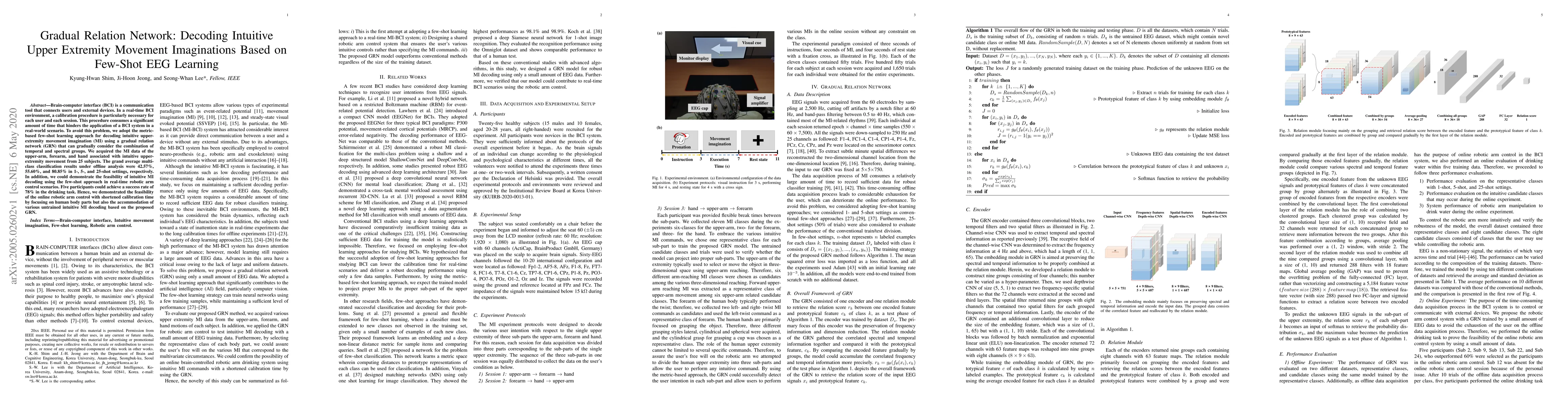 This paper proposes a gradual relation network (GRN) for decoding intuitive upper-extremity movement imaginations using few-shot EEG learning, significantly reducing calibration time in brain-computer interfaces. The method achieved multiclass classification rates of 42.57%, 55.60%, and 80.85% in 1-, 5-, and 25-shot settings, respectively, and demonstrated a 78% success rate in real-time robotic arm control tasks.