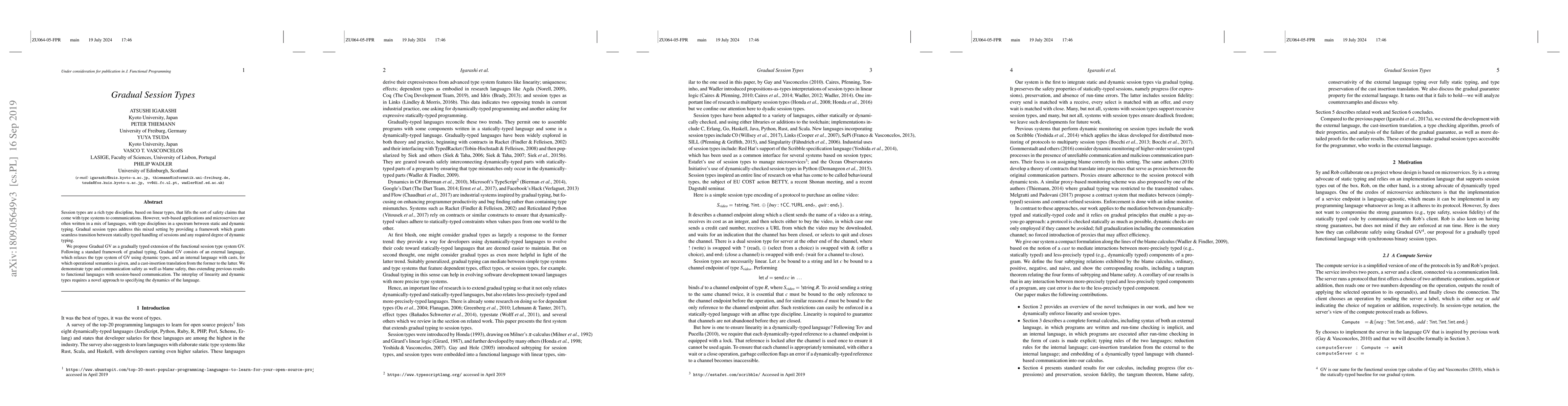 Gradual session types provide a framework allowing seamless transitions between static and dynamic typing in session-based communications, ensuring type, communication, and blame safety. The Gradual GV system combines an external language with dynamic types and an internal language with casts to achieve this.