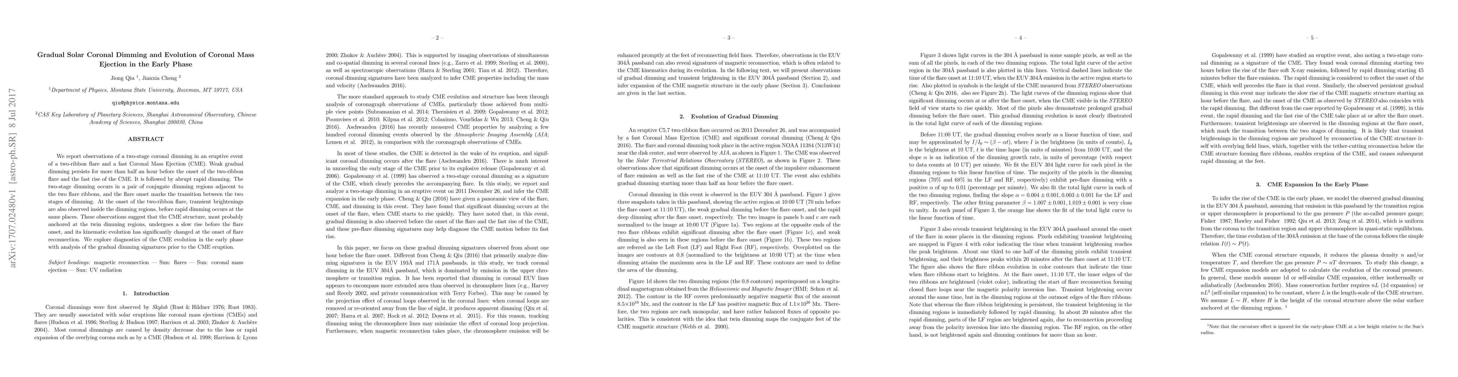 This paper reports on a two-stage coronal dimming preceding a two-ribbon flare and a fast coronal mass ejection (CME), suggesting a gradual rise of the CME structure before flare reconnection, followed by rapid dimming. The study uses observations to analyze the gradual dimming signatures and their implications for CME evolution.