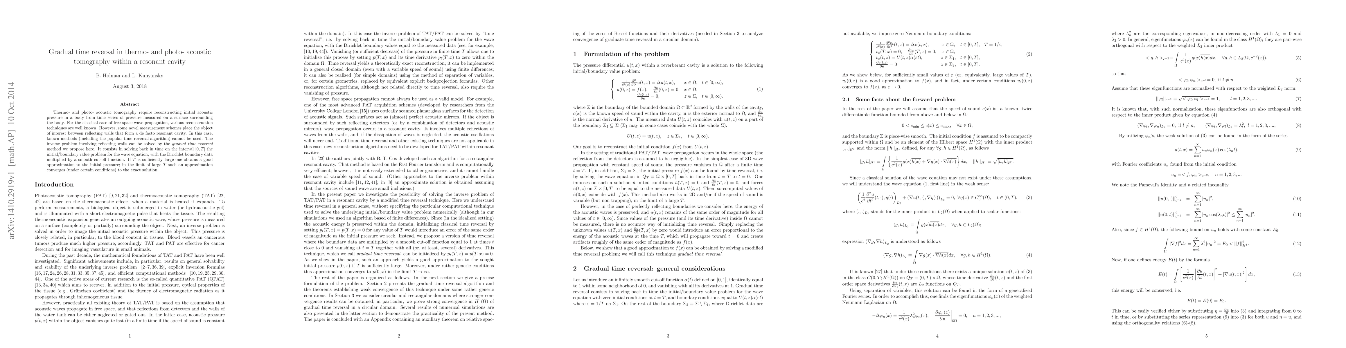 Researchers propose a new method for reconstructing initial acoustic pressure in objects within resonant cavities using gradual time reversal, offering a solution to previous limitations in thermo- and photo-acoustic tomography.