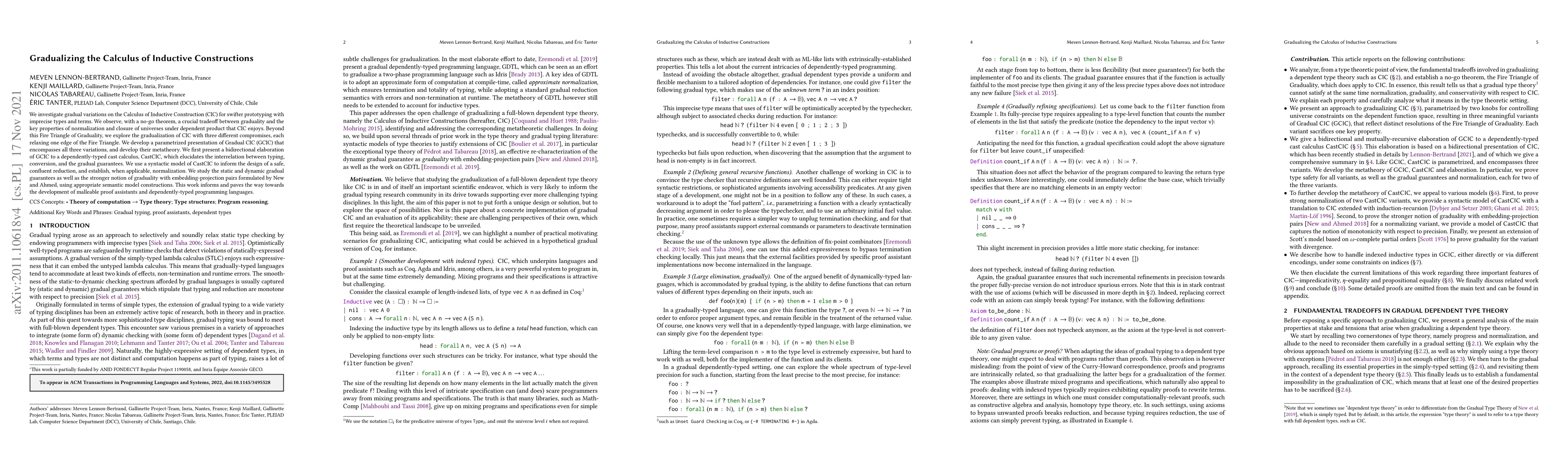 We investigate gradual variations on the Calculus of Inductive Construction (CIC) for swifter prototyping with imprecise types and terms. We observe, with a no-go theorem, a crucial tradeoff between graduality and the key properties of normalization and closure of universes under dependent product that CIC enjoys. Beyond this Fire Triangle of Graduality, we explore the gradualization of CIC with three different compromises, each relaxing one edge of the Fire Triangle. We develop a parametrized presentation of Gradual CIC (GCIC) that encompasses all three variations, and develop their metatheory. We first present a bidirectional elaboration of GCIC to a dependently-typed cast calculus, CastCIC, which elucidates the interrelation between typing, conversion, and the gradual guarantees. We use a syntactic model of CastCIC to inform the design of a safe, confluent reduction, and establish, when applicable, normalization. We study the static and dynamic gradual guarantees as well as the stronger notion of graduality with embedding-projection pairs formulated by New and Ahmed, using appropriate semantic model constructions. This work informs and paves the way towards the development of malleable proof assistants and dependently-typed programming languages.