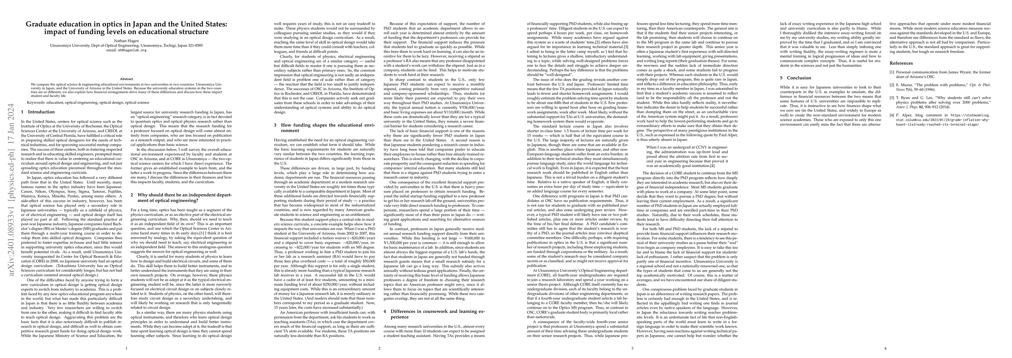 This paper compares optical science and engineering education at Utsunomiya University in Japan and the University of Arizona in the U.S., highlighting how funding levels influence educational structures and affect both student and faculty experiences due to differing national education systems.