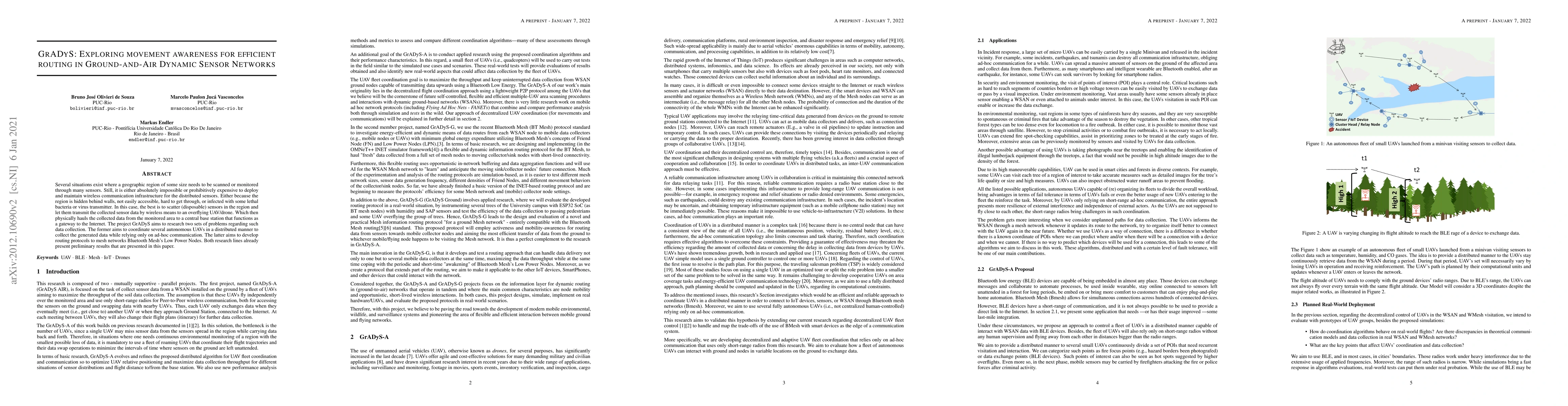 Several situations exist where a geographic region of some size needs to be scanned or monitored through many sensors. Still, it is either absolutely impossible or prohibitively expensive to deploy and maintain wireless communication infrastructure for the distributed sensors. Either because the region is hidden behind walls, not easily accessible, hard to get through, or infected with some lethal bacteria or virus transmitter. In this case, the best is to scatter (disposable) sensors in the region and let them transmit the collected sensor data by wireless means to an overflying UAV/drone. Which then physically hauls the collected data from the monitored area to a central base station that functions as a gateway to the Internet. The project GrADyS aims to research two sets of problems regarding such data collection. The former aims to coordinate several autonomous UAVs in a distributed manner to collect the generated data while relying only on ad-hoc communication. The latter aims to develop routing protocols to mesh networks Bluetooth Mesh's Low Power Nodes. Both research lines already present preliminary results that are presented in this paper.