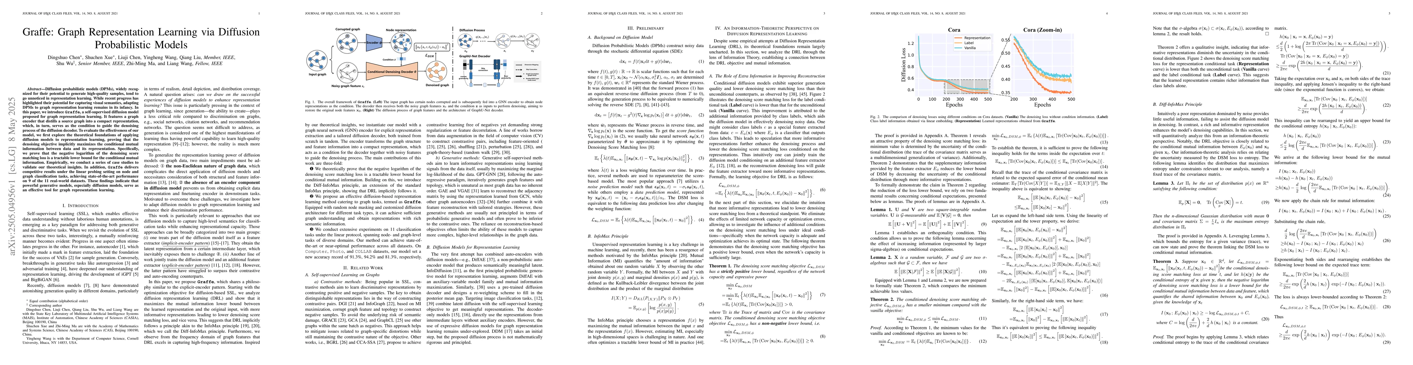 Diffusion probabilistic models (DPMs), widely recognized for their potential to generate high-quality samples, tend to go unnoticed in representation learning. While recent progress has highlighted their potential for capturing visual semantics, adapting DPMs to graph representation learning remains in its infancy. In this paper, we introduce Graffe, a self-supervised diffusion model proposed for graph representation learning. It features a graph encoder that distills a source graph into a compact representation, which, in turn, serves as the condition to guide the denoising process of the diffusion decoder. To evaluate the effectiveness of our model, we first explore the theoretical foundations of applying diffusion models to representation learning, proving that the denoising objective implicitly maximizes the conditional mutual information between data and its representation. Specifically, we prove that the negative logarithm of the denoising score matching loss is a tractable lower bound for the conditional mutual information. Empirically, we conduct a series of case studies to validate our theoretical insights. In addition, Graffe delivers competitive results under the linear probing setting on node and graph classification tasks, achieving state-of-the-art performance on 9 of the 11 real-world datasets. These findings indicate that powerful generative models, especially diffusion models, serve as an effective tool for graph representation learning.