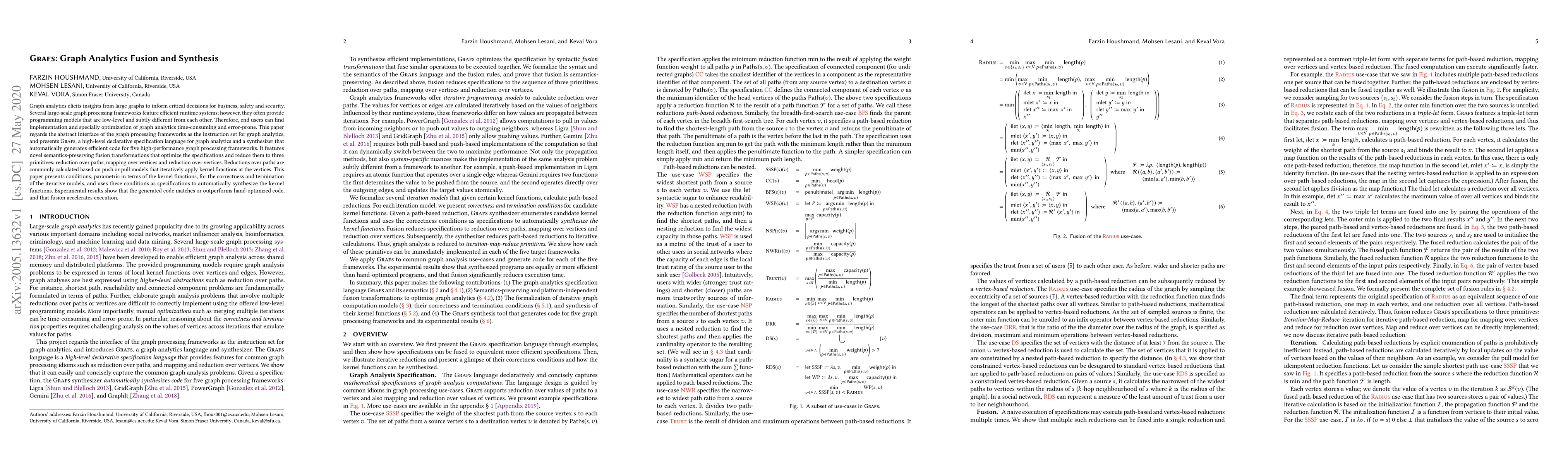 GraFS is a high-level declarative language for graph analytics that synthesizes efficient code for various high-performance graph processing frameworks. It employs fusion transformations to optimize specifications and reduce them to three primitives, achieving competitive performance against hand-optimized code.