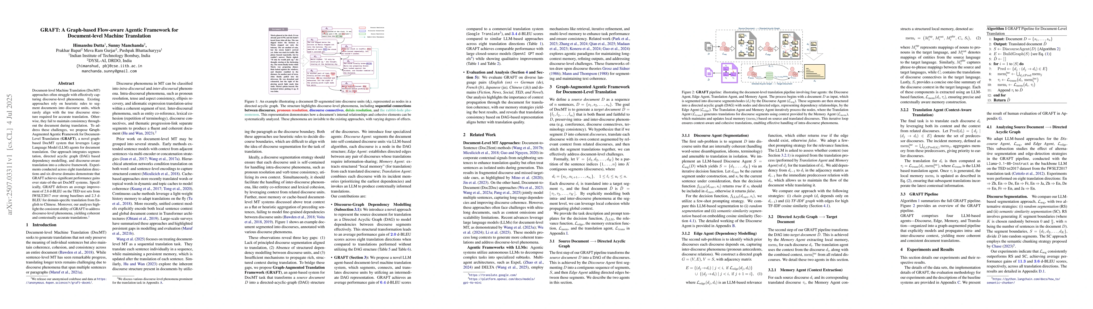 Document level Machine Translation (DocMT) approaches often struggle with effectively capturing discourse level phenomena. Existing approaches rely on heuristic rules to segment documents into discourse units, which rarely align with the true discourse structure required for accurate translation. Otherwise, they fail to maintain consistency throughout the document during translation. To address these challenges, we propose Graph Augmented Agentic Framework for Document Level Translation (GRAFT), a novel graph based DocMT system that leverages Large Language Model (LLM) agents for document translation. Our approach integrates segmentation, directed acyclic graph (DAG) based dependency modelling, and discourse aware translation into a cohesive framework. Experiments conducted across eight translation directions and six diverse domains demonstrate that GRAFT achieves significant performance gains over state of the art DocMT systems. Specifically, GRAFT delivers an average improvement of 2.8 d BLEU on the TED test sets from IWSLT2017 over strong baselines and 2.3 d BLEU for domain specific translation from English to Chinese. Moreover, our analyses highlight the consistent ability of GRAFT to address discourse level phenomena, yielding coherent and contextually accurate translations.