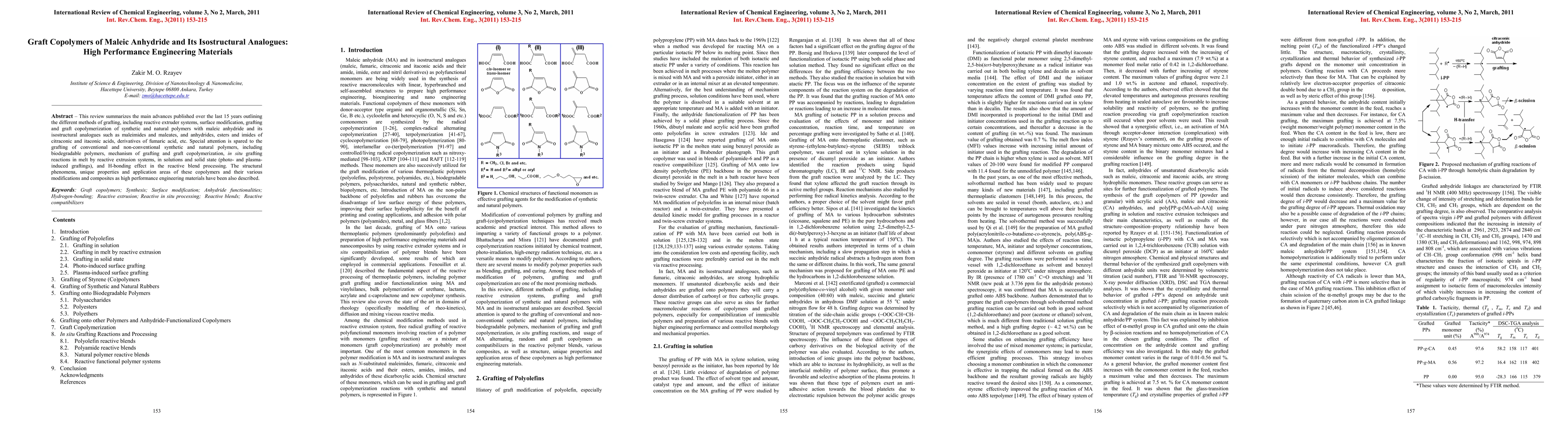 This review summarizes the main advances published over the last 15 years outlining the different methods of grafting, including reactive extruder systems, surface modification, grafting and graft copolymerization of synthetic and natural polymers with maleic anhydride and its isostructural analogues such as maleimides and maleates, and anhydrides, esters and imides of citraconic and itaconic acids, derivatives of fumaric acid, etc. Special attention is spared to the grafting of conventional and non-conventional synthetic and natural polymers, including biodegradable polymers, mechanism of grafting and graft copolymerization, in situ grafting reactions in melt by reactive extrusion systems, in solutions and solid state (photo- and plasma-induced graftings), and H-bonding effect in the reactive blend processing. The structural phenomena, unique properties and application areas of these copolymers and their various modifications and composites as high performance engineering materials have been also described.