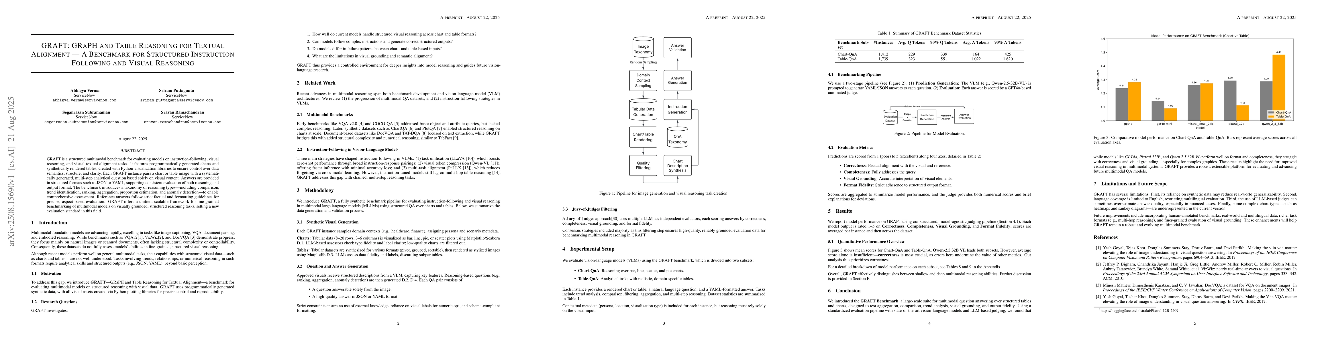 GRAFT is a structured multimodal benchmark for evaluating models on instruction-following, visual reasoning, and visual-textual alignment tasks. It features programmatically generated charts and synthetically rendered tables, created with Python visualization libraries to ensure control over data semantics, structure, and clarity. Each GRAFT instance pairs a chart or table image with a systematically generated, multi-step analytical question based solely on visual content. Answers are provided in structured formats such as JSON or YAML, supporting consistent evaluation of both reasoning and output format. The benchmark introduces a taxonomy of reasoning types including comparison, trend identification, ranking, aggregation, proportion estimation, and anomaly detection to enable comprehensive assessment. Reference answers follow strict factual and formatting guidelines for precise, aspect-based evaluation. GRAFT offers a unified, scalable framework for fine-grained benchmarking of multimodal models on visually grounded, structured reasoning tasks, setting a new evaluation standard in this field.
