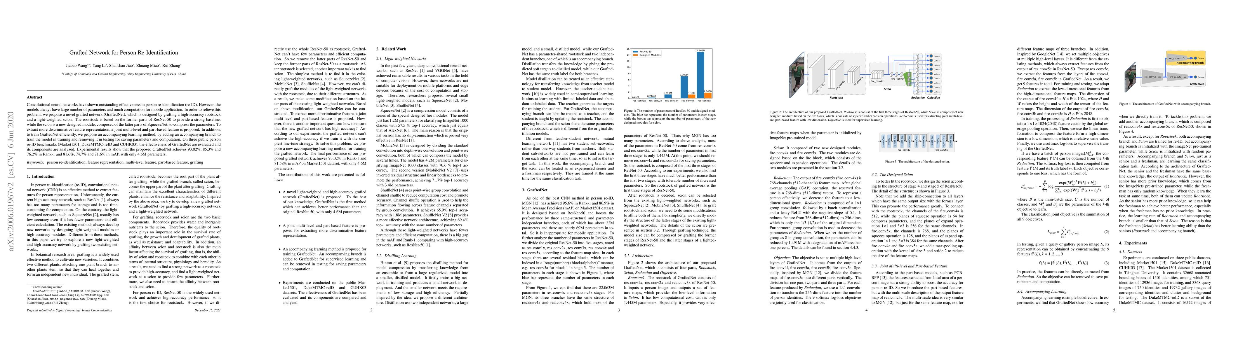 The paper proposes GraftedNet, a novel grafted network for person re-identification that combines a high-accuracy ResNet-50 rootstock with a lightweight SqueezeNet scion to reduce parameters and computation. The model achieves high accuracy on three benchmarks with only 4.6M parameters.