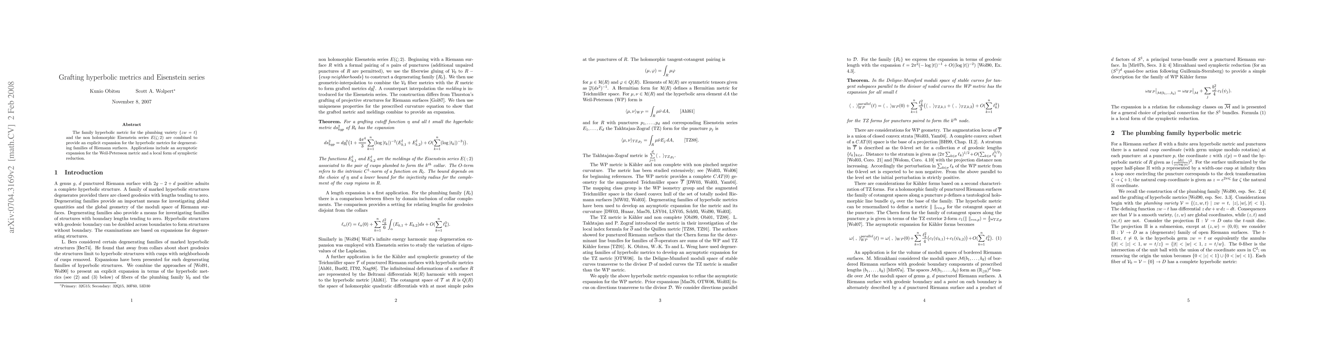 The paper combines hyperbolic metrics from the plumbing variety with Eisenstein series to develop explicit expansions for hyperbolic metrics in degenerating families of Riemann surfaces, leading to applications like asymptotic expansions for the Weil-Petersson metric and local symplectic reduction.