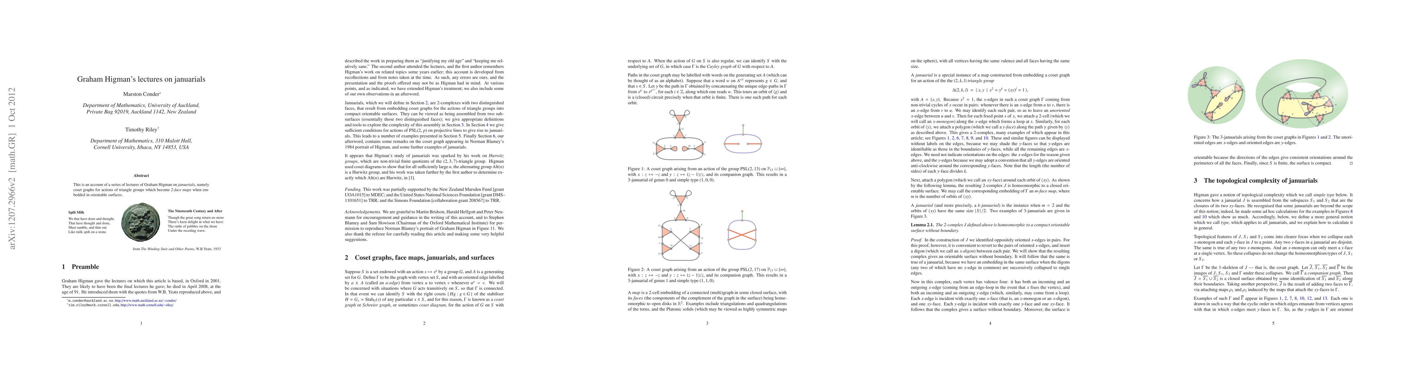 Summary: Graham Higman's lectures explore "januarials," coset graphs derived from triangle group actions, which transform into 2-face maps when embedded in orientable surfaces, providing insights into their structural properties.