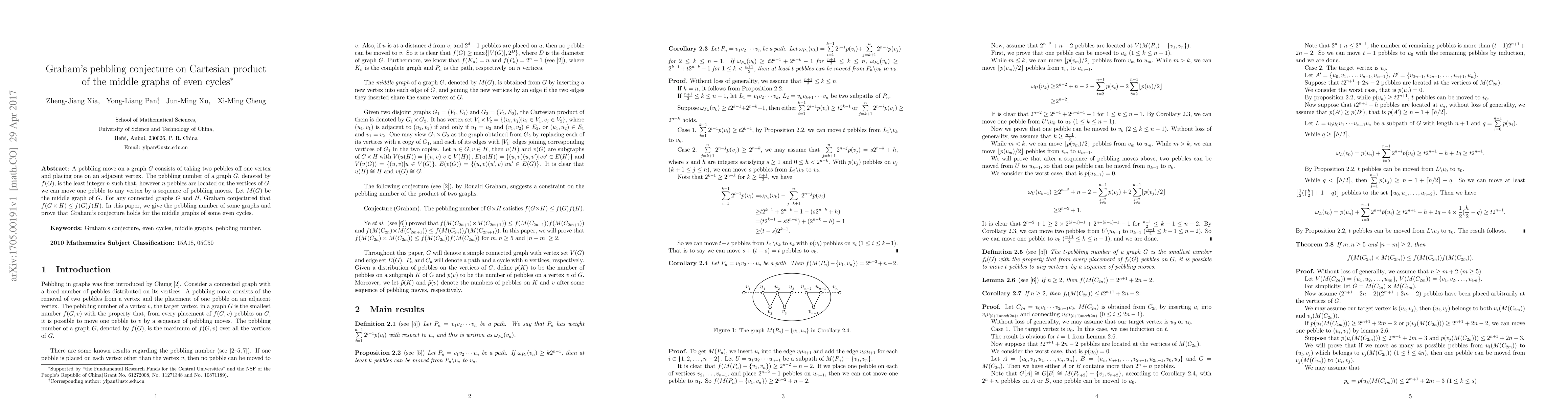 A pebbling move on a graph $G$ consists of taking two pebbles off one vertex and placing one on an adjacent vertex. The pebbling number of a graph $G$, denoted by $f(G)$, is the least integer $n$ such that, however $n$ pebbles are located on the vertices of $G$, we can move one pebble to any vertex by a sequence of pebbling moves. Let $M(G)$ be the middle graph of $G$. For any connected graphs $G$ and $H$, Graham conjectured that $f(G\times H)\leq f(G)f(H)$. In this paper, we give the pebbling number of some graphs and prove that Graham's conjecture holds for the middle graphs of some even cycles.
