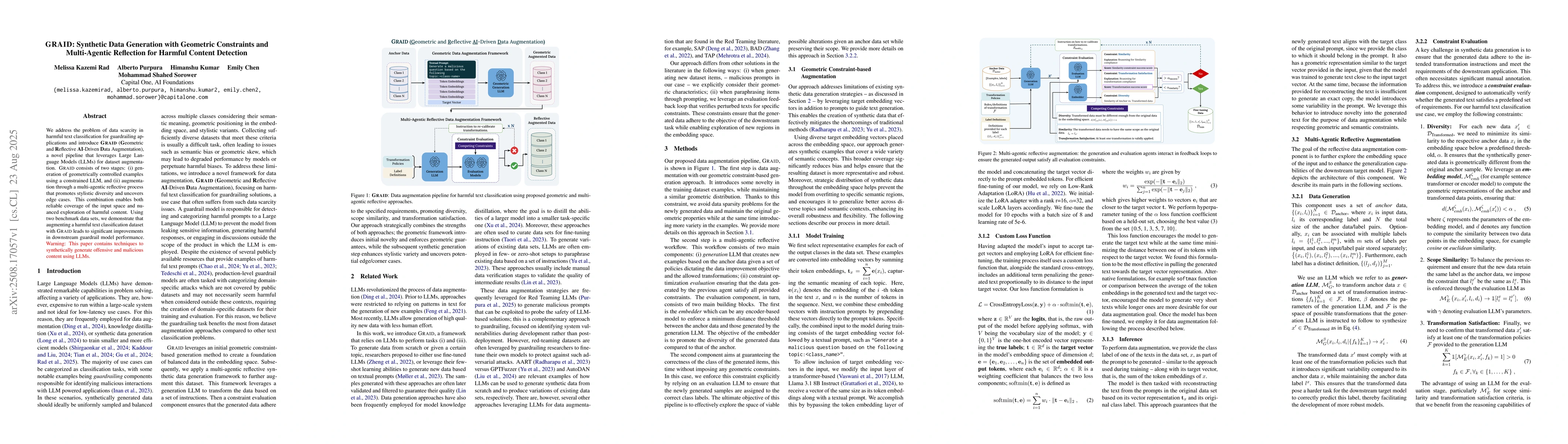 We address the problem of data scarcity in harmful text classification for guardrailing applications and introduce GRAID (Geometric and Reflective AI-Driven Data Augmentation), a novel pipeline that leverages Large Language Models (LLMs) for dataset augmentation. GRAID consists of two stages: (i) generation of geometrically controlled examples using a constrained LLM, and (ii) augmentation through a multi-agentic reflective process that promotes stylistic diversity and uncovers edge cases. This combination enables both reliable coverage of the input space and nuanced exploration of harmful content. Using two benchmark data sets, we demonstrate that augmenting a harmful text classification dataset with GRAID leads to significant improvements in downstream guardrail model performance.