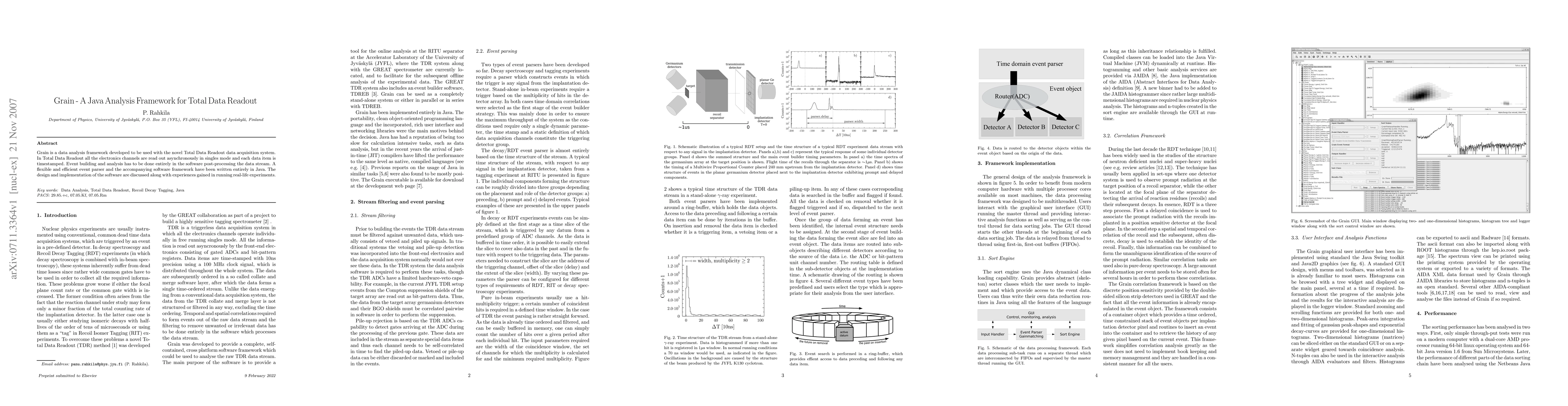 Grain is a data analysis framework developed to be used with the novel Total Data Readout data acquisition system. In Total Data Readout all the electronics channels are read out asynchronously in singles mode and each data item is timestamped. Event building and analysis has to be done entirely in the software post-processing the data stream. A flexible and efficient event parser and the accompanying software framework have been written entirely in Java. The design and implementation of the software are discussed along with experiences gained in running real-life experiments.