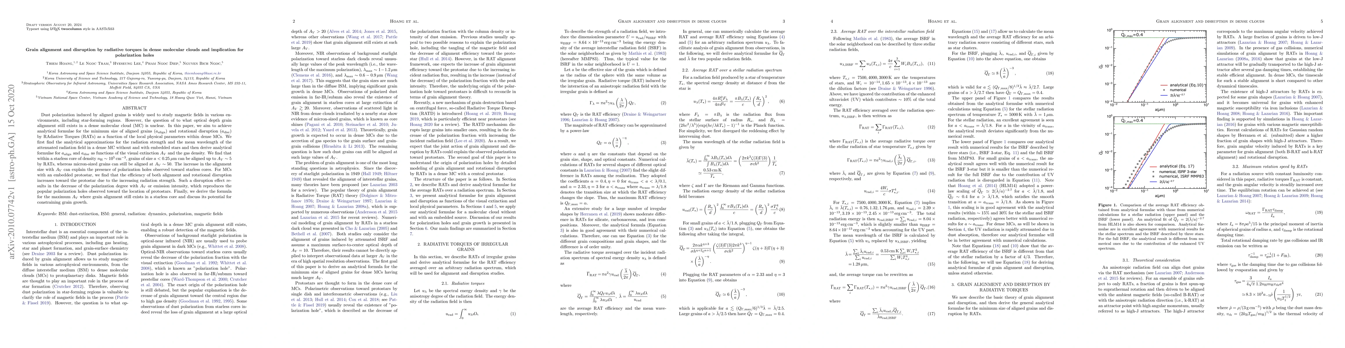 This paper develops analytical models to determine the minimum grain size for alignment and disruption by radiative torques (RATs) in dense molecular clouds, finding that smaller grains can remain aligned at higher optical depths in starless cores, while protostars increase disruption, explaining observed polarization holes.