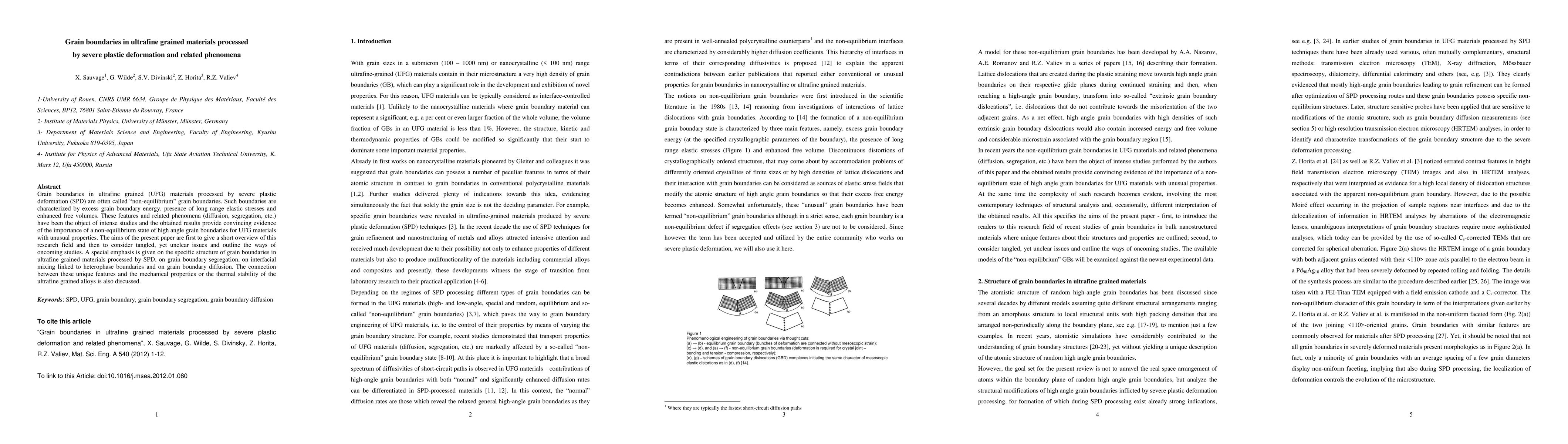 The paper provides a comprehensive review of grain boundaries in ultrafine-grained materials processed by severe plastic deformation (SPD), focusing on non-equilibrium grain boundaries and related phenomena such as segregation, interfacial mixing, and diffusion.