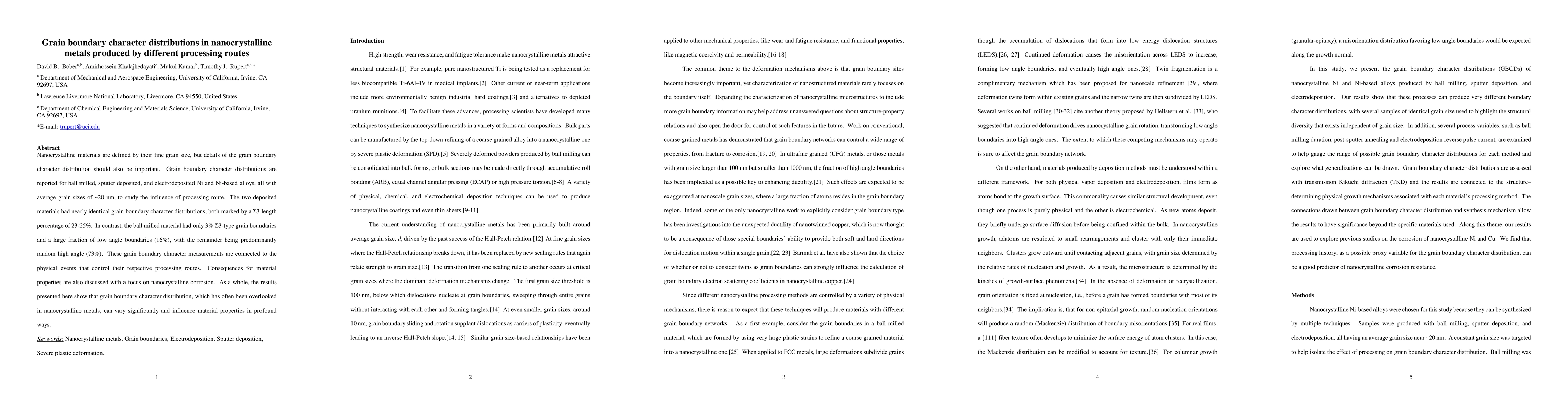 This study investigates grain boundary character distributions in nanocrystalline Ni and Ni-based alloys processed via ball milling, sputtering, and electrodeposition, revealing significant differences in boundary types influenced by processing routes. The deposited materials share similar grain boundary characteristics, while the milled material exhibits a higher proportion of random high-angle boundaries and fewer low-angle boundaries, highlighting the impact on material properties, particularly nanocrystalline corrosion.