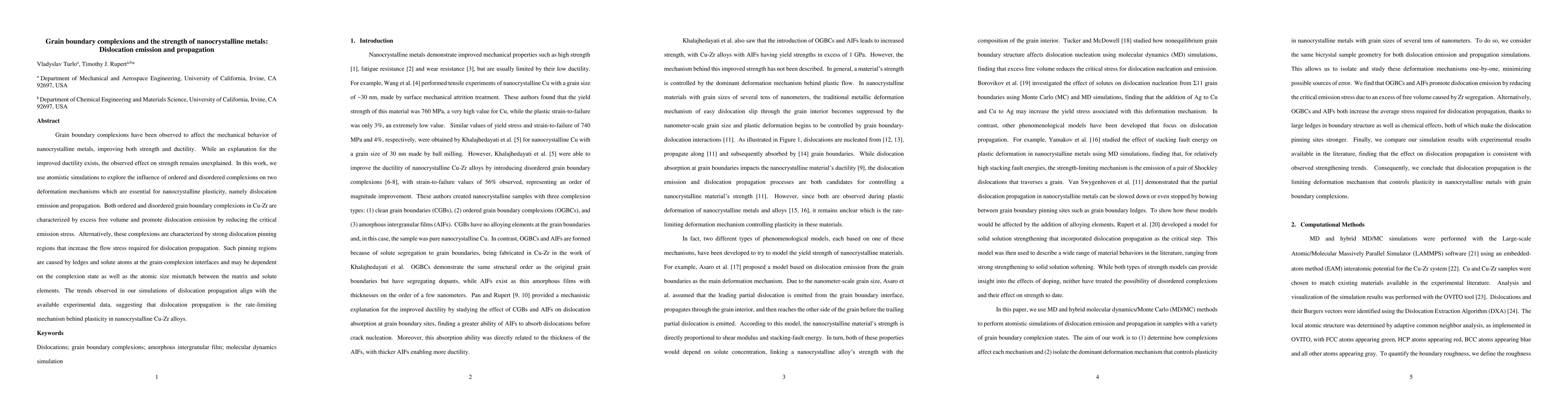 This study uses atomistic simulations to investigate how ordered and disordered grain boundary complexions in Cu-Zr affect dislocation emission and propagation, revealing that they enhance strength by promoting dislocation emission while impeding dislocation propagation through strong pinning regions. The findings suggest dislocation propagation is the key limiting factor for plasticity in nanocrystalline Cu-Zr alloys.