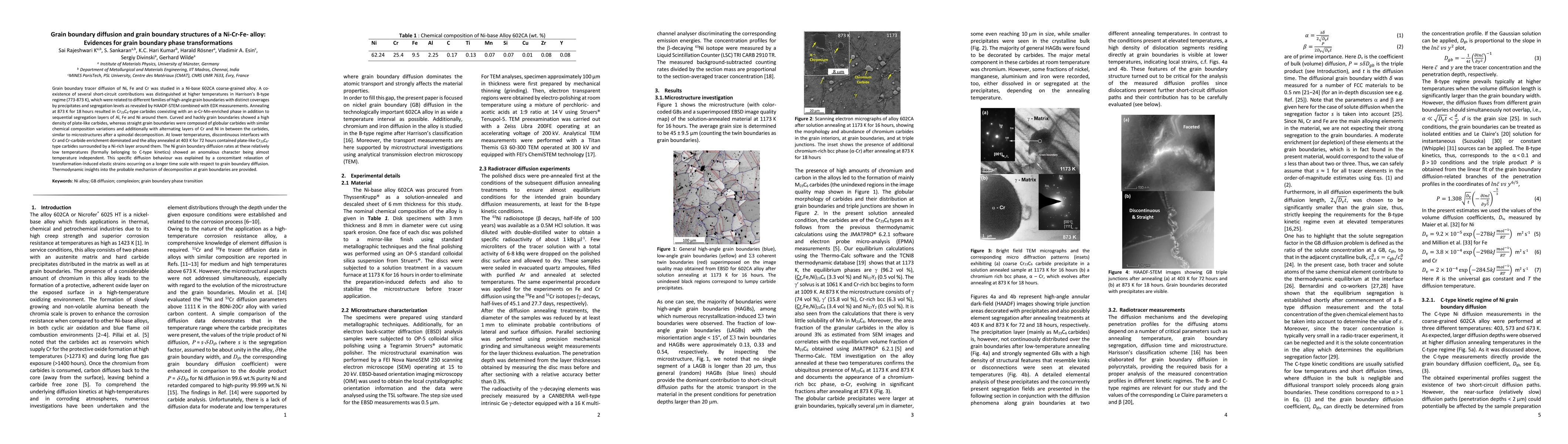 This study investigates grain boundary diffusion and structures in a Ni-Cr-Fe alloy, revealing distinct grain boundary phase transformations and carbide formations at different temperatures. At higher temperatures, complex grain boundary diffusion patterns and carbide segregations are observed, while lower temperatures show anomalous diffusion behavior linked to strain relaxation.
