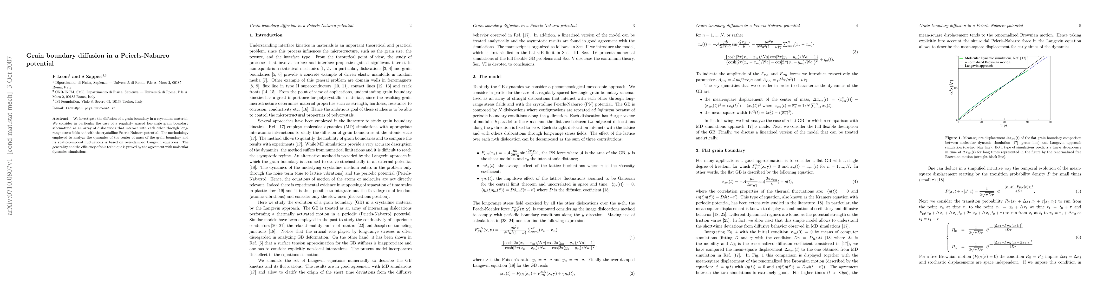We investigate the diffusion of a grain boundary in a crystalline material. We consider in particular the case of a regularly spaced low-angle grain boundary schematized as an array of dislocations that interact with each other through long-range stress fields and with the crystalline Peierls-Nabarro potential. The methodology employed to analyze the dynamics of the center of mass of the grain boundary and its spatio-temporal fluctuations is based on over-damped Langevin equations. The generality and the efficiency of this technique is proved by the agreement with molecular dynamics simulations.