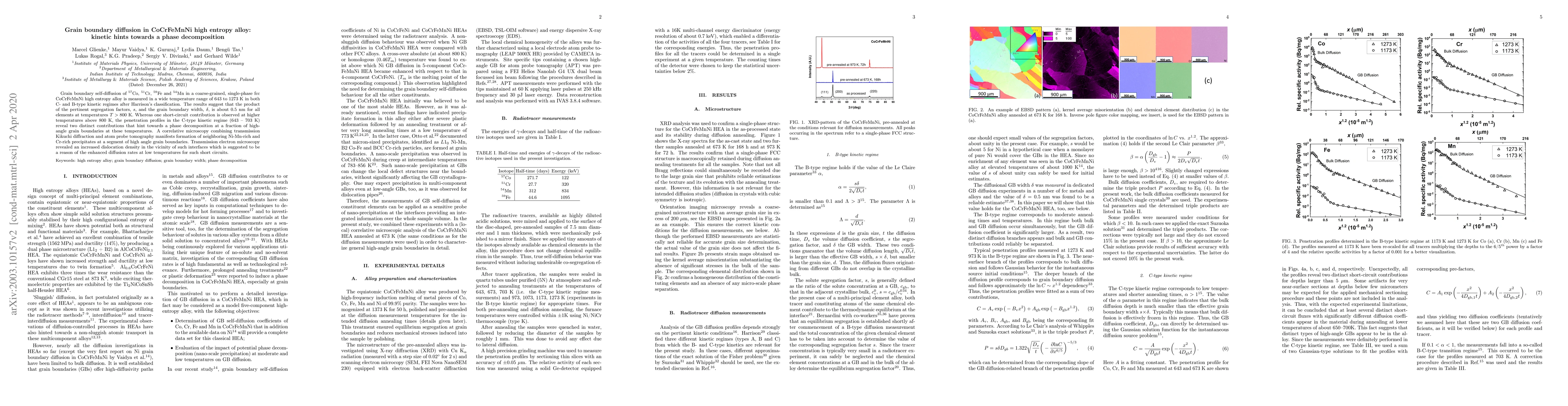 This study investigates grain boundary diffusion in CoCrFeMnNi high entropy alloy, revealing distinct kinetic regimes and suggesting phase decomposition at high-angle grain boundaries. Enhanced diffusion at low temperatures is linked to the formation of Ni-Mn-rich and Cr-rich precipitates and increased dislocation density.