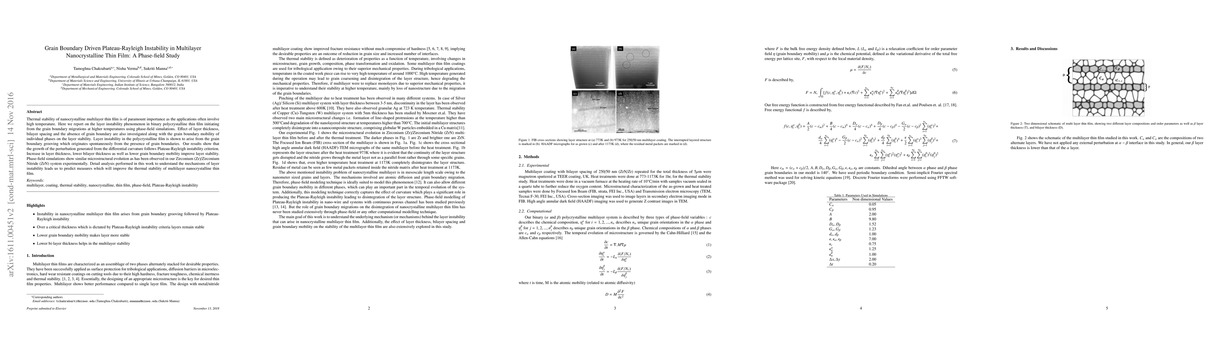 Thermal stability of nanocrystalline multilayer thin film is of paramount importance as the applications often involve high temperature. Here we report on the layer instability phenomenon in binary polycrystalline thin film initiating from the grain boundary migrations at higher temperatures using phase-field simulations. Effect of layer thickness, bilayer spacing and the absence of grain boundary are also investigated along with the grain boundary mobility of individual phases on the layer stability. Layer instability in the polycrystalline film is shown to arise from the grain boundary grooving which originates spontaneously from the presence of grain boundaries. Our results show that the growth of the perturbation generated from the differential curvature follows Plateau-Rayleigh instability criterion. Increase in layer thickness, lower bilayer thickness as well as lower grain boundary mobility improve layer stability. Phase-field simulations show similar microstructural evolution as has been observed in our Zirconium (Zr)/Zirconium Nitride (ZrN) system experimentally. Detail analysis performed in this work to understand the mechanisms of layer instability leads us to predict measures which will improve the thermal stability of multilayer nanocrystalline thin film.