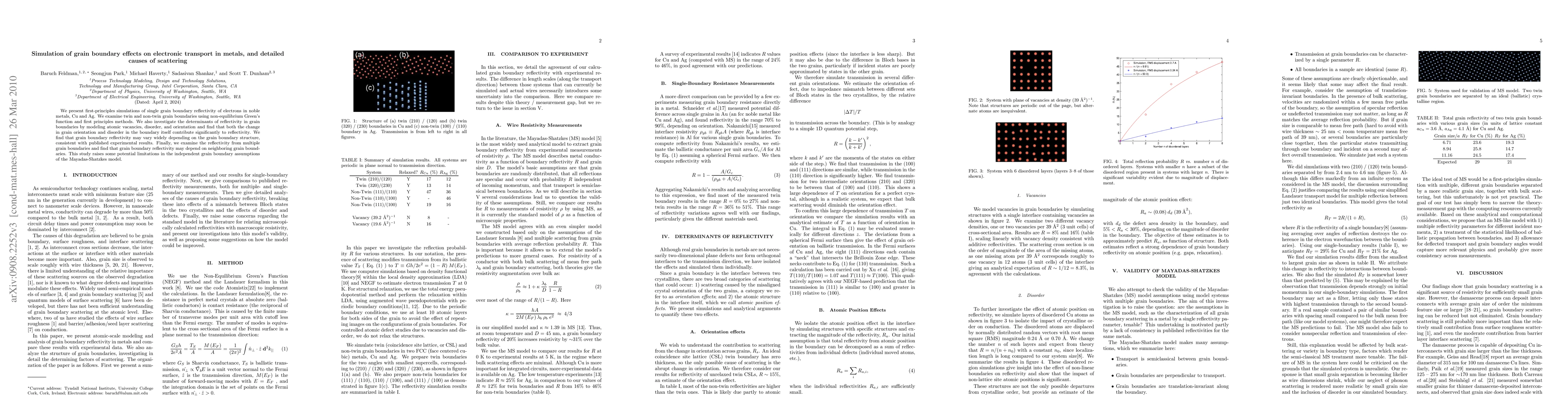This study uses quantum simulations to analyze electron reflectivity at grain boundaries in Cu and Ag metals, revealing significant effects from grain orientation and disorder. The research challenges the independent grain boundary assumption in the Mayadas-Shatzkes model and suggests that grain boundary reflectivity can vary widely based on boundary structure and interactions with neighboring boundaries.