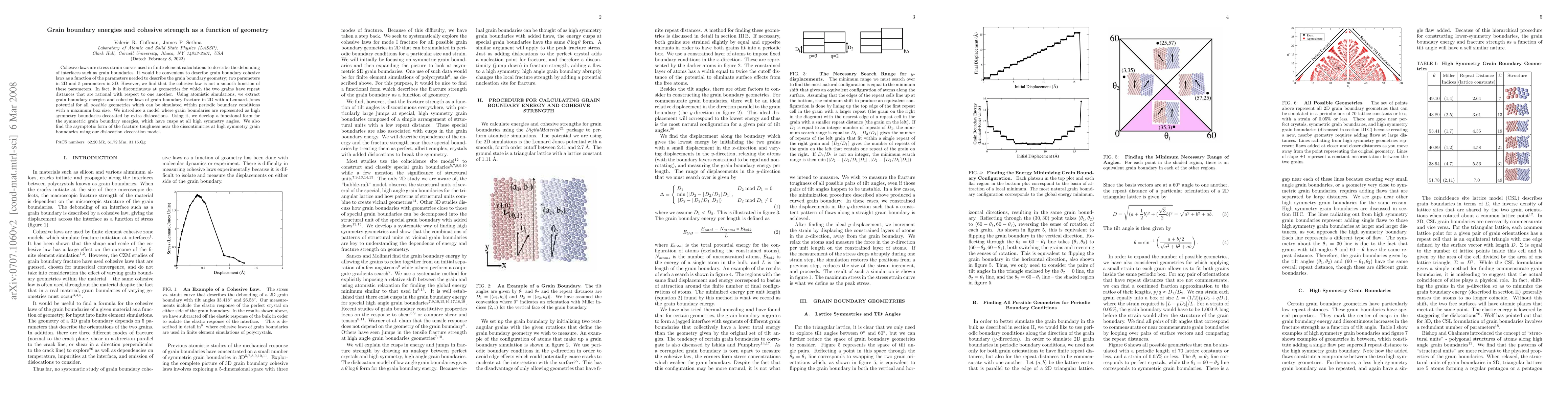 This paper investigates the relationship between grain boundary geometry and cohesive strength, revealing that grain boundary cohesive laws are discontinuous at specific geometries where grain repeat distances are rational. The authors use atomistic simulations to derive a model for symmetric grain boundary energies, showing cusps at high symmetry angles and determining the fracture toughness near these discontinuities.
