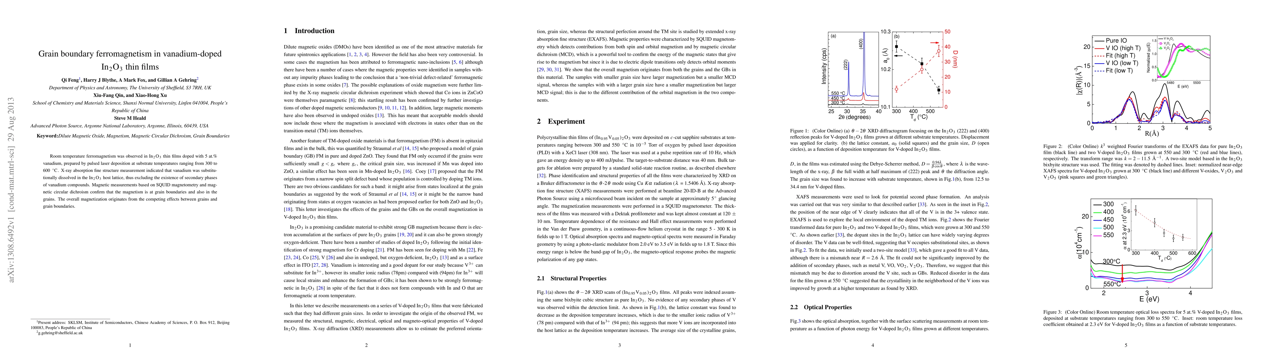This study presents a detailed analysis of the structural and magnetic properties of vanadium-doped In2O3 thin films, confirming the existence of grain boundary ferromagnetism and its dependence on deposition temperature.