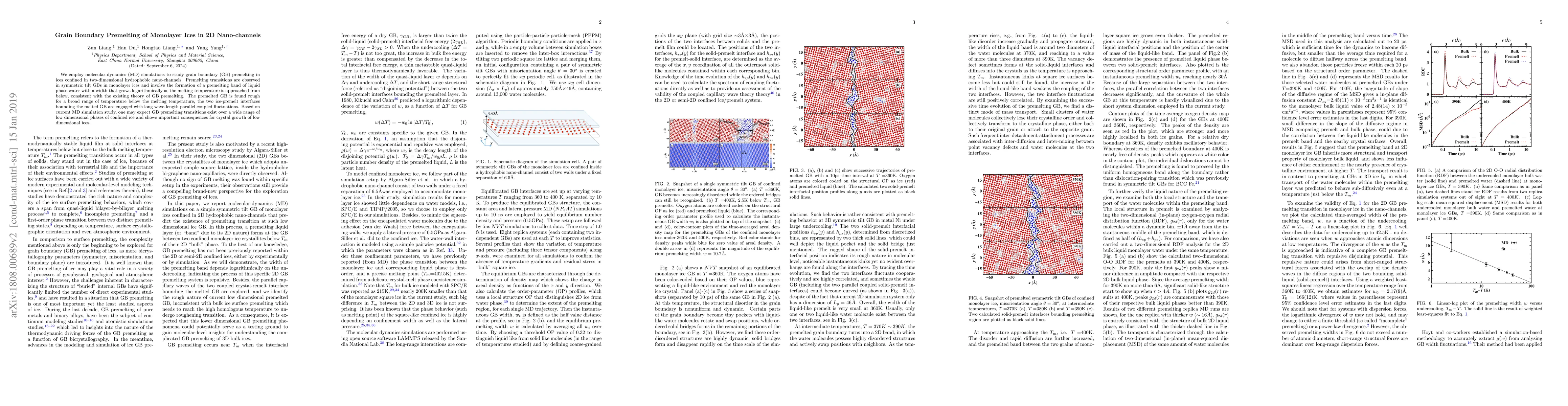 This study uses molecular-dynamics simulations to investigate grain boundary premelting in monolayer ices within two-dimensional hydrophobic nano-channels, revealing a logarithmically growing premelting band as the melting temperature is approached, consistent with theoretical predictions. The findings suggest that grain boundary premelting may occur broadly in low-dimensional confined ices, impacting crystal growth processes.