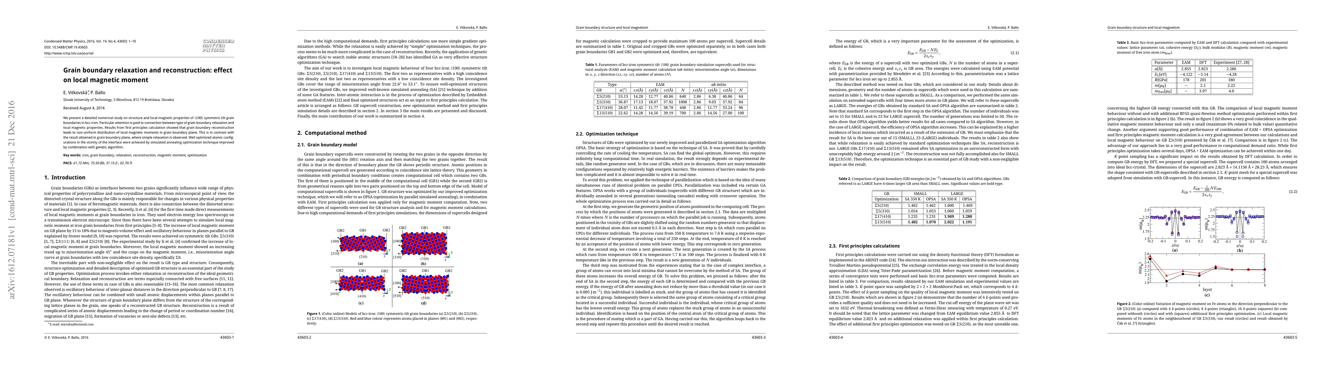 We present a detailed numerical study on structure and local magnetic properties of $\langle 100 \rangle$ symmetric tilt grain boundaries in bcc-iron. Particular attention is paid to connection between type of grain boundary relaxation and local magnetic properties. Results from first principles calculation showed that grain boundary reconstruction leads to non-uniform distribution of local magnetic moments in grain boundary plane. This is in contrast with the result obtained in grain boundary plane, where simple relaxation is observed. Well optimized atomic configurations in the vicinity of the interface were achieved by simulated annealing optimization technique improved by combination with genetic algorithm.