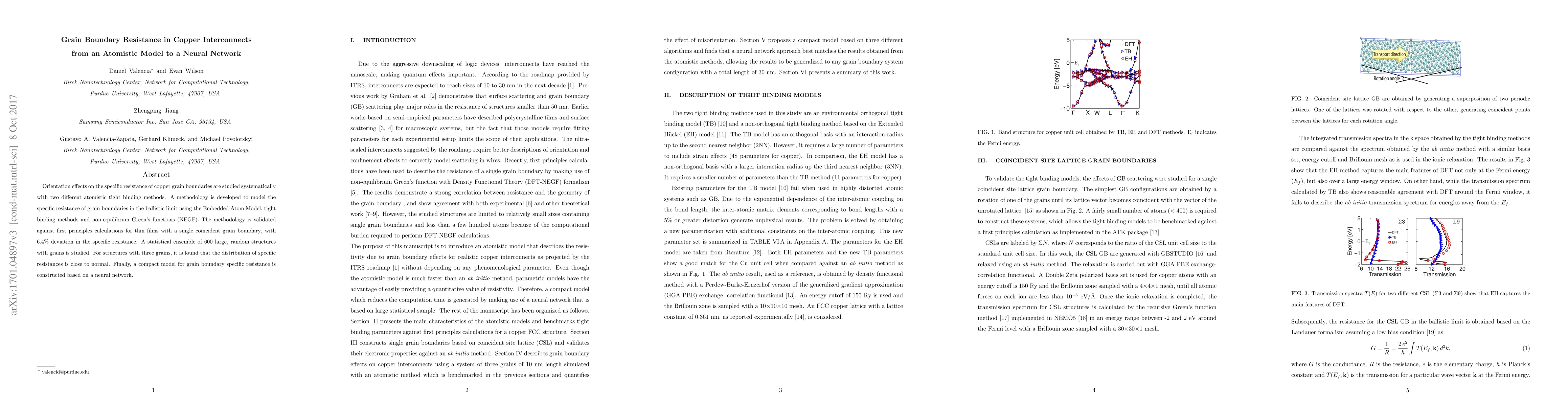 This paper investigates the resistivity of copper grain boundaries using atomistic tight binding methods and develops a neural network model to predict it. The methodology is validated with first principles calculations, showing a 6.4% deviation, and a neural network model is constructed to compactly represent the resistivity distribution.