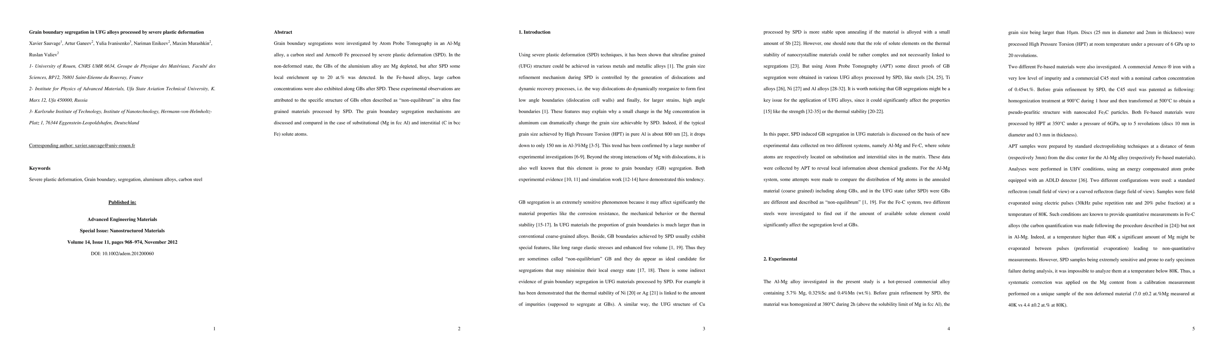 This study investigates grain boundary segregation in UFG alloys processed by severe plastic deformation using Atom Probe Tomography. It reveals that SPD induces local enrichment of Mg in Al-Mg alloys and significant carbon concentration in Fe-based alloys along grain boundaries, attributed to the "non-equilibrium" structure of grain boundaries in SPD-processed ultrafine-grained materials.