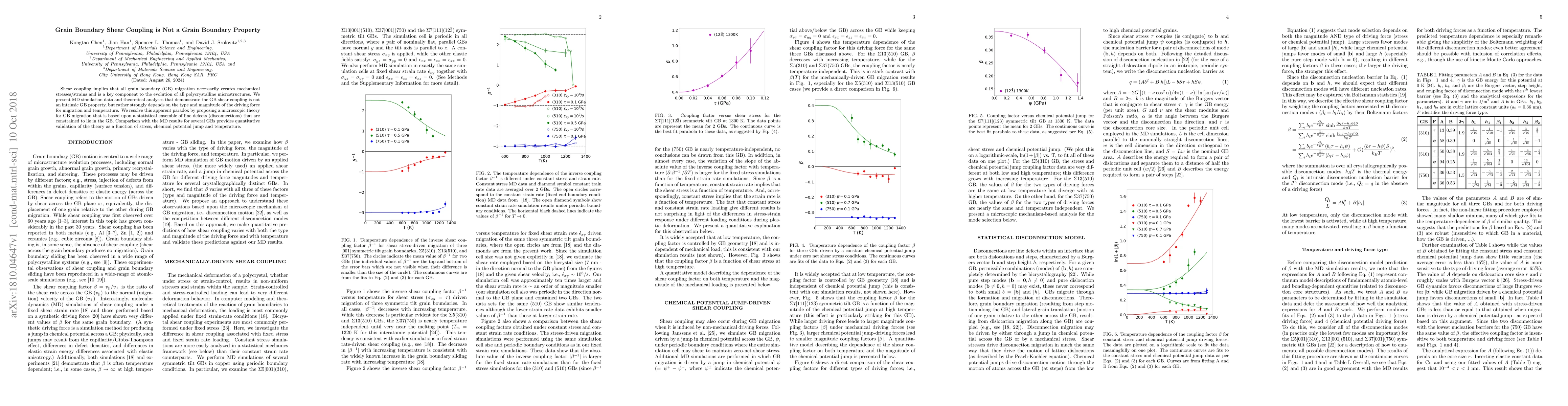 Grain boundary shear coupling is not an inherent property of grain boundaries but depends on driving force for migration and temperature. A new theory proposing a statistical ensemble of line defects resolves the apparent paradox with MD simulation data validation.