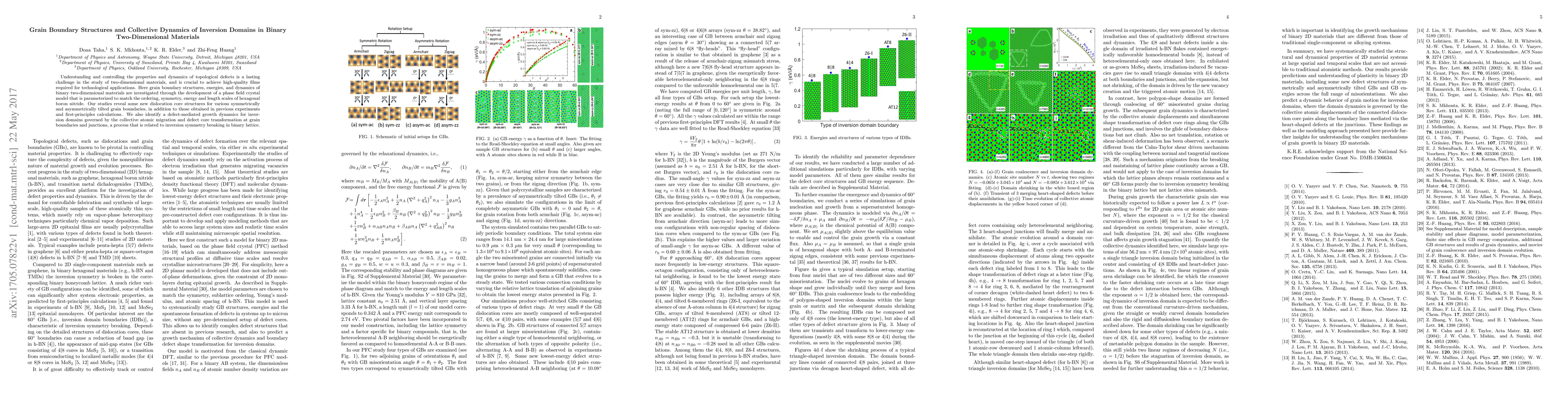 This paper explores the grain boundary structures and dynamics of inversion domains in binary two-dimensional materials using a phase field crystal model. It reveals new dislocation core structures for various grain boundaries and identifies defect-mediated growth dynamics for inversion domains, highlighting the role of collective atomic migration and defect transformations.