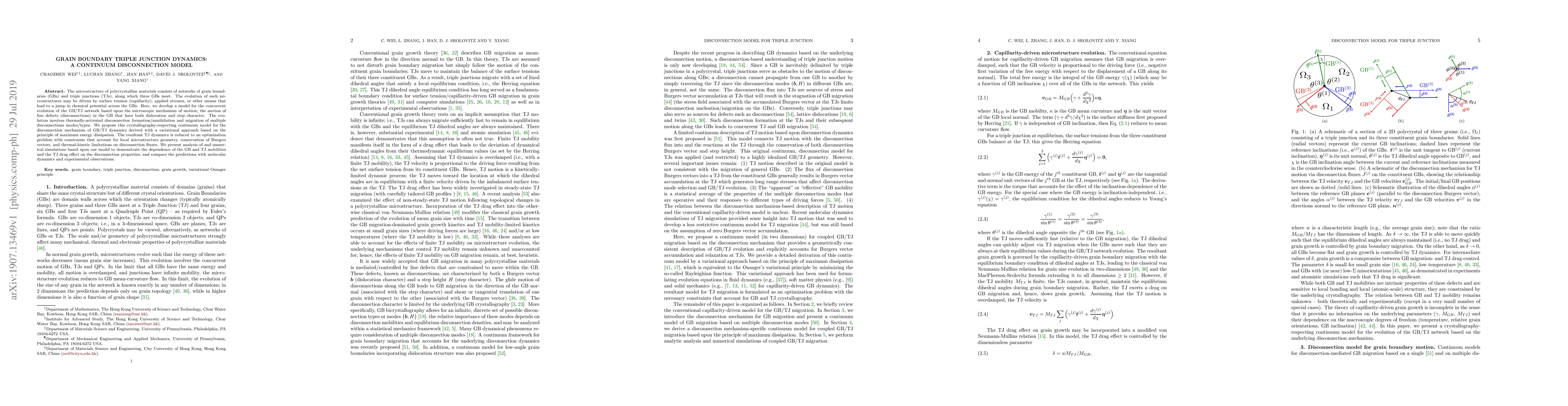 The microstructure of polycrystalline materials consists of networks of grain boundaries (GBs) and triple junctions (TJs), along which three GBs meet. The evolution of such microstructures may be driven by surface tension (capillarity), applied stresses, or other means that lead to a jump in chemical potential across the GBs. Here, we develop a model for the concurrent evolution of the GB/TJ network based upon the microscopic mechanism of motion; the motion of line defects (disconnections) in the GB that have both dislocation and step character. The evolution involves thermally-activated disconnection formation/annihilation and migration of multiple disconnections modes/types. We propose this crystallography-respecting continuum model for the disconnection mechanism of GB/TJ dynamics derived with a variational approach based on the principle of maximum energy dissipation. The resultant TJ dynamics is reduced to an optimization problem with constraints that account for local microstructure geometry, conservation of Burgers vectors, and thermal-kinetic limitations on disconnection fluxes. We present analysis of and numerical simulations based upon our model to demonstrate the dependence of the GB and TJ mobilities and the TJ drag effect on the disconnection properties, and compare the predictions with molecular dynamics and experimental observations.