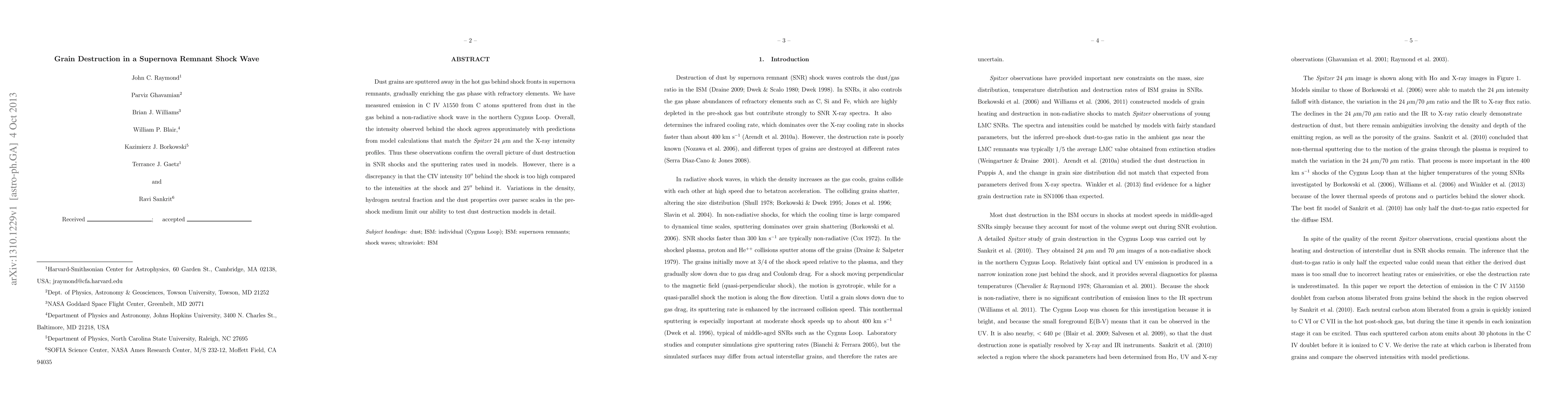 This study measures C IV emission from carbon atoms sputtered from dust in the Cygnus Loop supernova remnant, confirming dust destruction in shock waves. However, a discrepancy in CIV intensity behind the shock suggests limitations in current models due to variations in pre-shock medium properties.