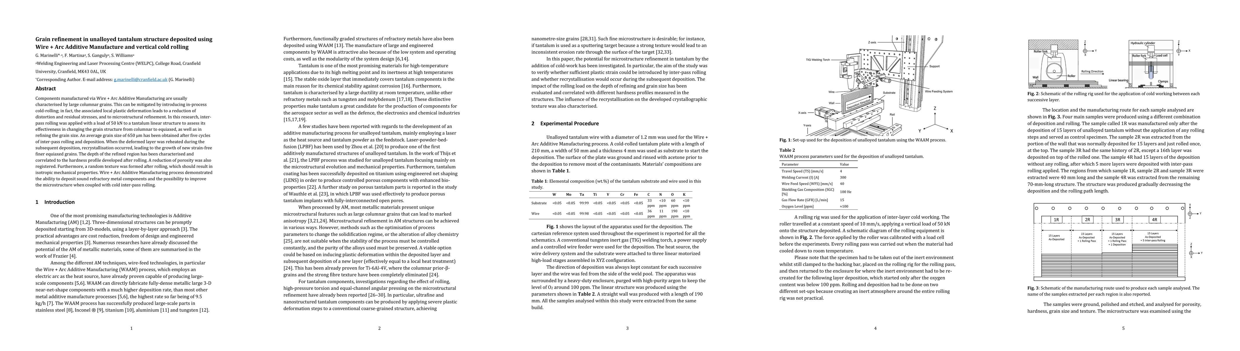 This study investigates the grain refinement in unalloyed tantalum deposited via Wire + Arc Additive Manufacturing, enhanced by inter-pass cold rolling, achieving an average grain size of 650 microns and improved mechanical properties through recrystallisation and isotropic texture formation.