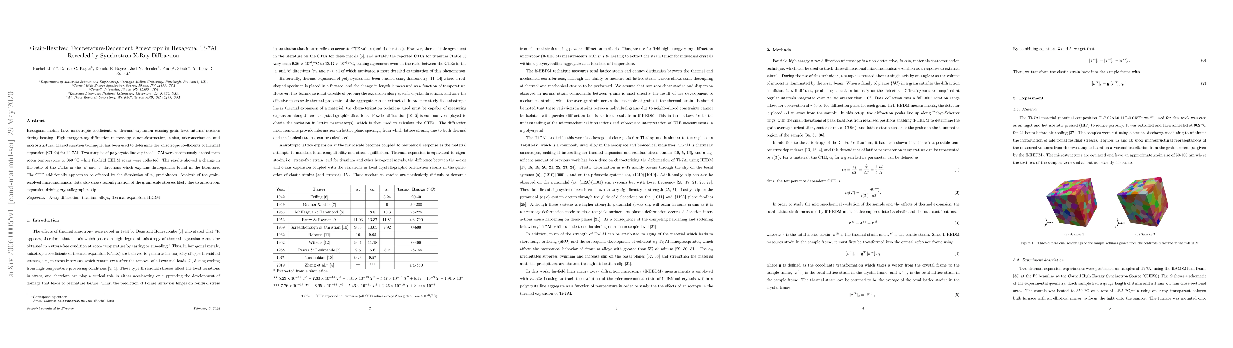 Hexagonal metals have anisotropic coefficients of thermal expansion causing grain-level internal stresses during heating. High energy x-ray diffraction microscopy, a non-destructive, in situ, micromechanical and microstructural characterization technique, has been used to determine the anisotropic coefficients of thermal expansion (CTEs) for Ti-7Al. Two samples of polycrystalline $\alpha$-phase Ti-7Al were continuously heated from room temperature to 850 $^\circ$C while far-field HEDM scans were collected. The results showed a change in the ratio of the CTEs in the 'a' and 'c' directions which explains discrepancies found in the literature. The CTE additionally appears to be affected by the dissolution of $\alpha_2$ precipitates. Analysis of the grain-resolved micromechanical data also shows reconfiguration of the grain scale stresses likely due to anisotropic expansion driving crystallographic slip.