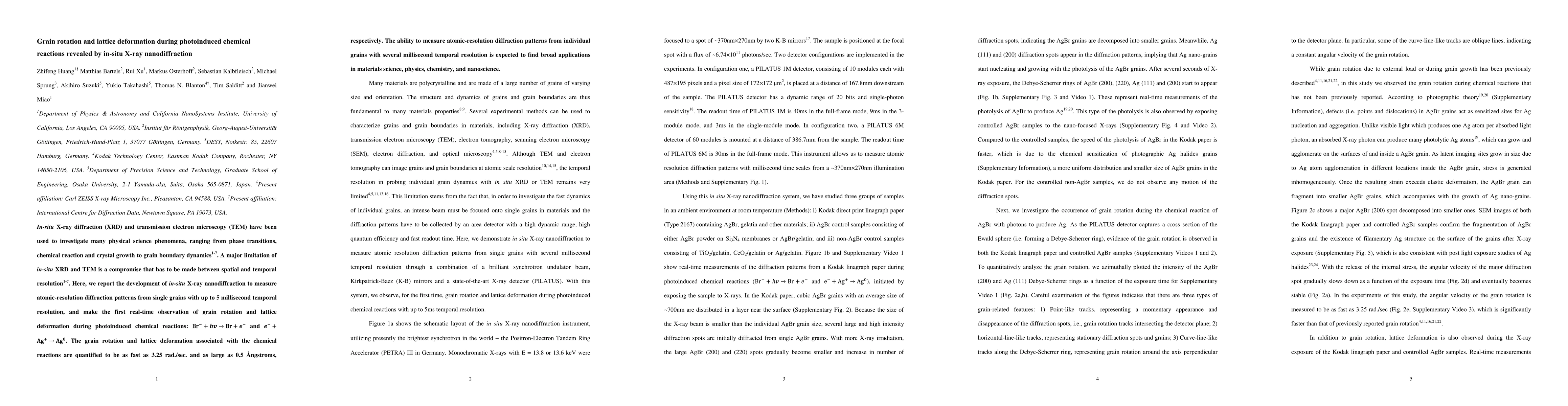 This paper develops in-situ X-ray nanodiffraction to observe atomic-resolution patterns with millisecond temporal resolution, revealing rapid grain rotation and lattice deformation during photoinduced chemical reactions, with rates up to 3.25 rad/sec and deformations up to 0.5 Angstroms. This technique holds promise for advancing materials science and related fields.