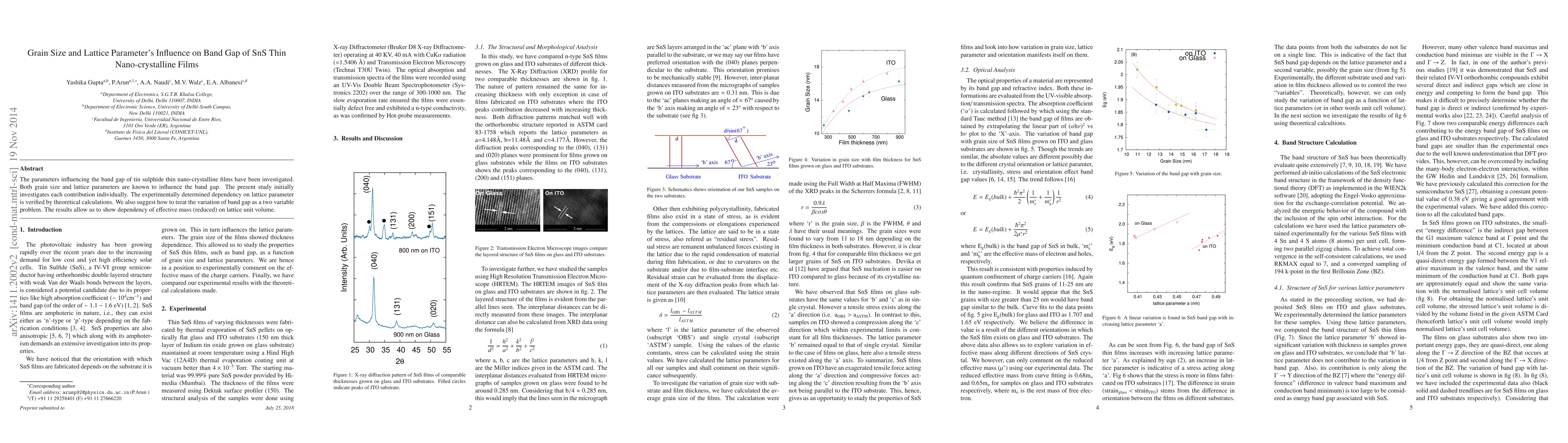 The parameters influencing the band gap of tin sulphide thin nano-crystalline films have been investigated. Both grain size and lattice parameters are known to influence the band gap. The present study initially investigates each contribution individually. The experimentally determined dependency on lattice parameter is verified by theoretical calculations. We also suggest how to treat the variation of band gap as a two variable problem. The results allow us to show dependency of effective mass (reduced) on lattice unit volume.