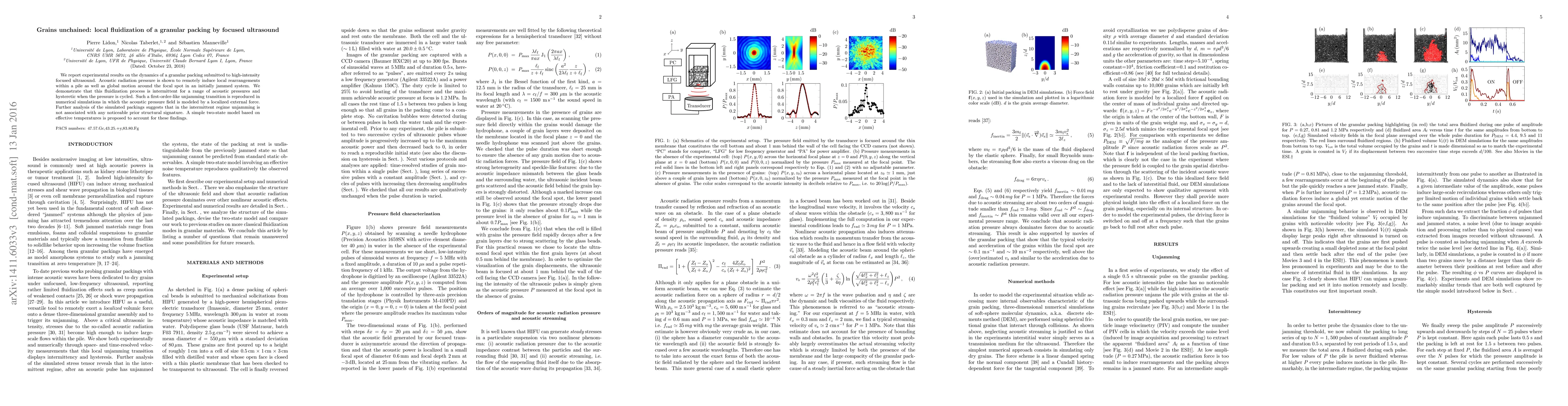 We report experimental results on the dynamics of a granular packing submitted to high-intensity focused ultrasound. Acoustic radiation pressure is shown to remotely induce local rearrangements within a pile as well as global motion around the focal spot in an initially jammed system. We demonstrate that this fluidization process is intermittent for a range of acoustic pressures and hysteretic when the pressure is cycled. Such a first-order-like unjamming transition is reproduced in numerical simulations in which the acoustic pressure field is modeled by a localized external force. Further analysis of the simulated packings suggests that in the intermittent regime unjamming is not associated with any noticeable prior structural signature. A simple two-state model based on effective temperatures is proposed to account for these findings.
