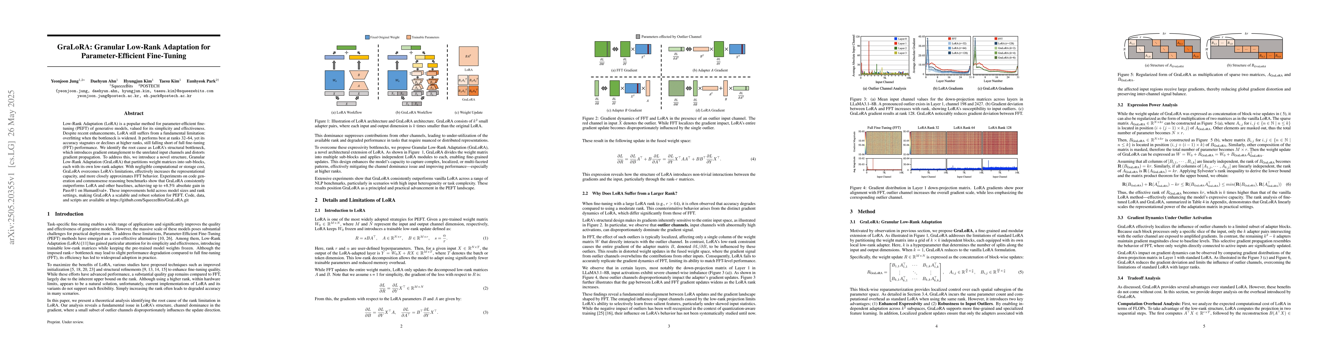 Researchers introduced GraLoRA, a new method for fine-tuning generative models that overcomes LoRA's limitations in accuracy by partitioning weight matrices into sub-blocks with low-rank adapters, leading to improved performance across model sizes and rank settings.